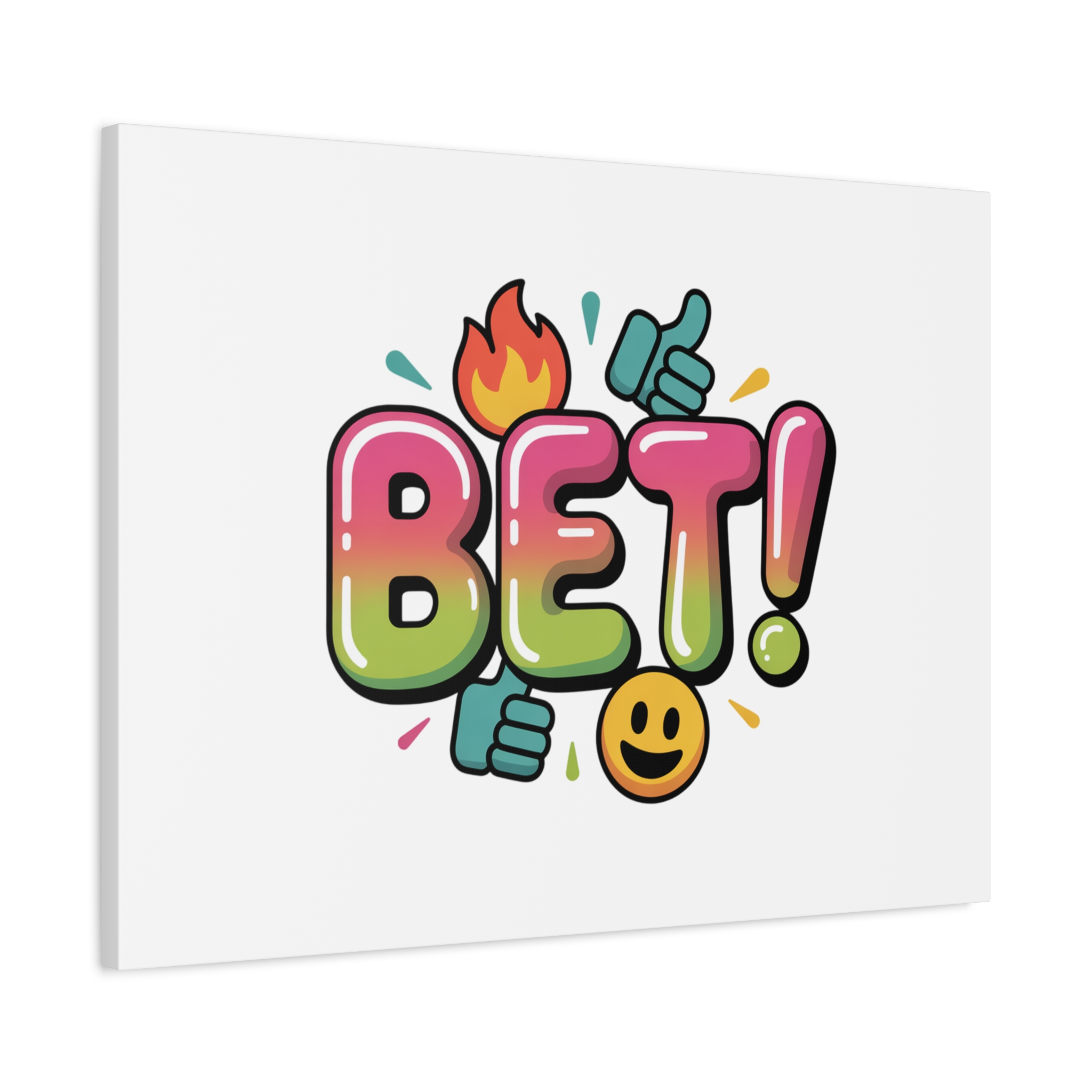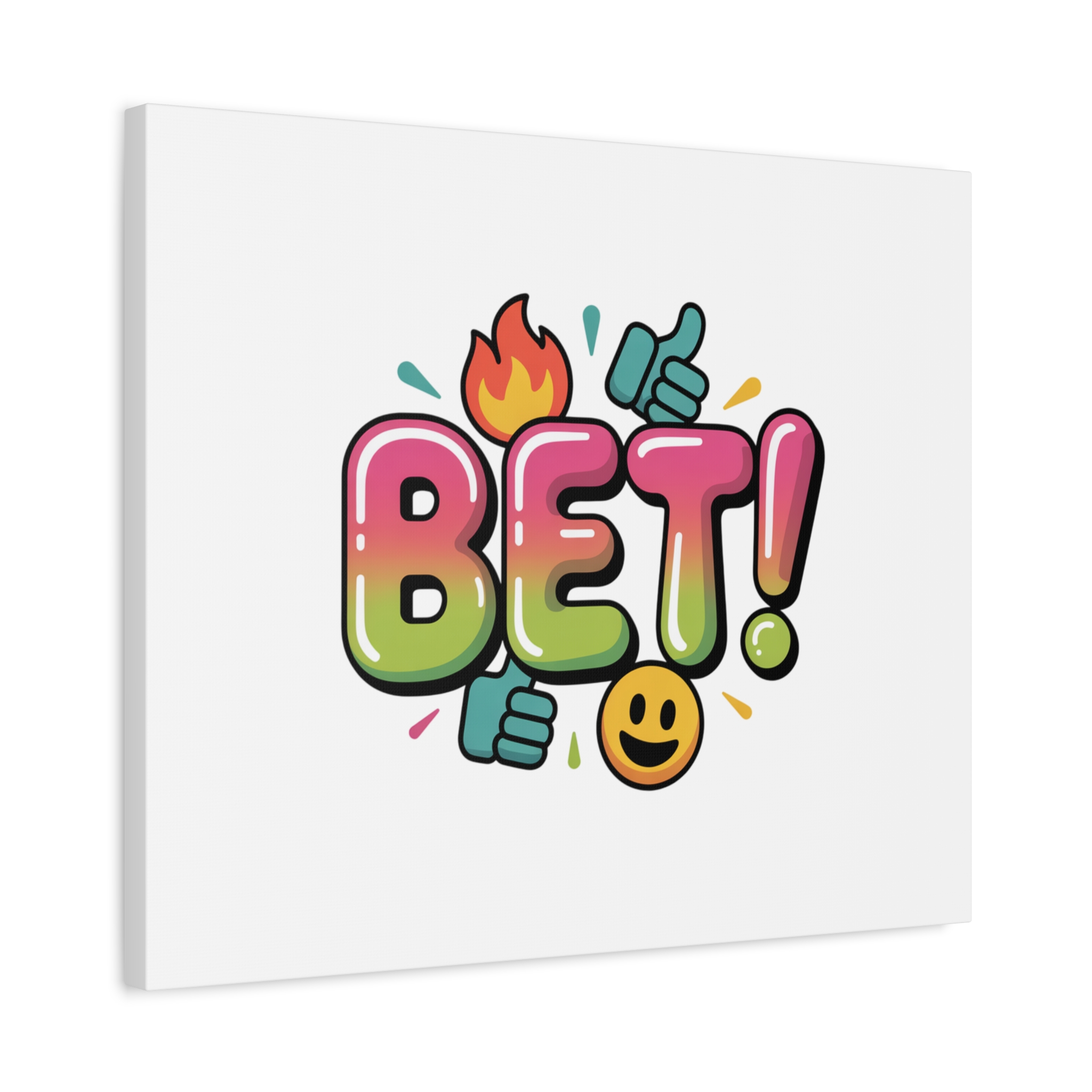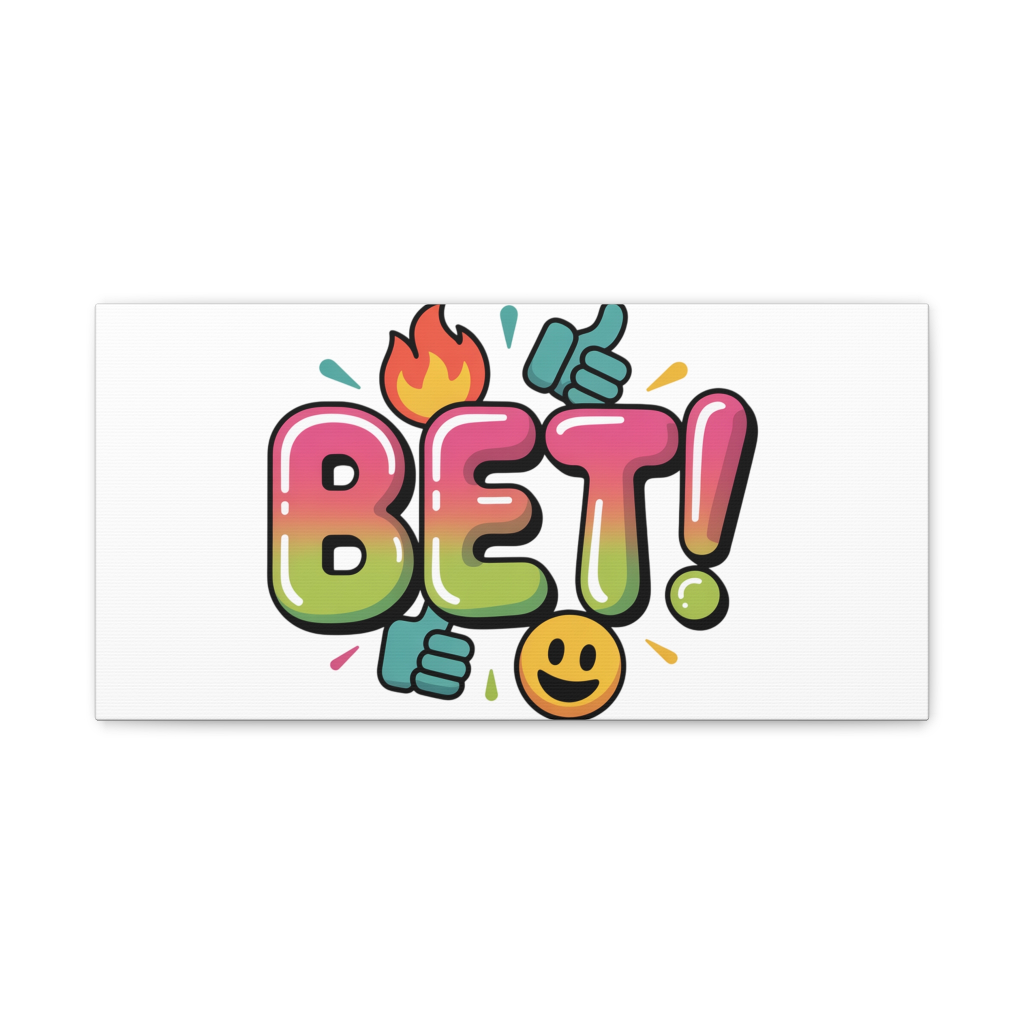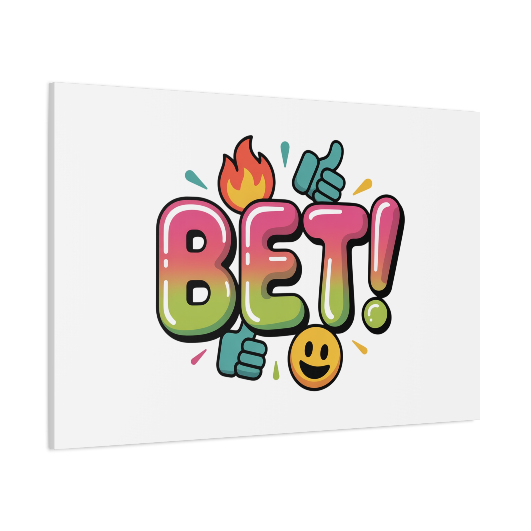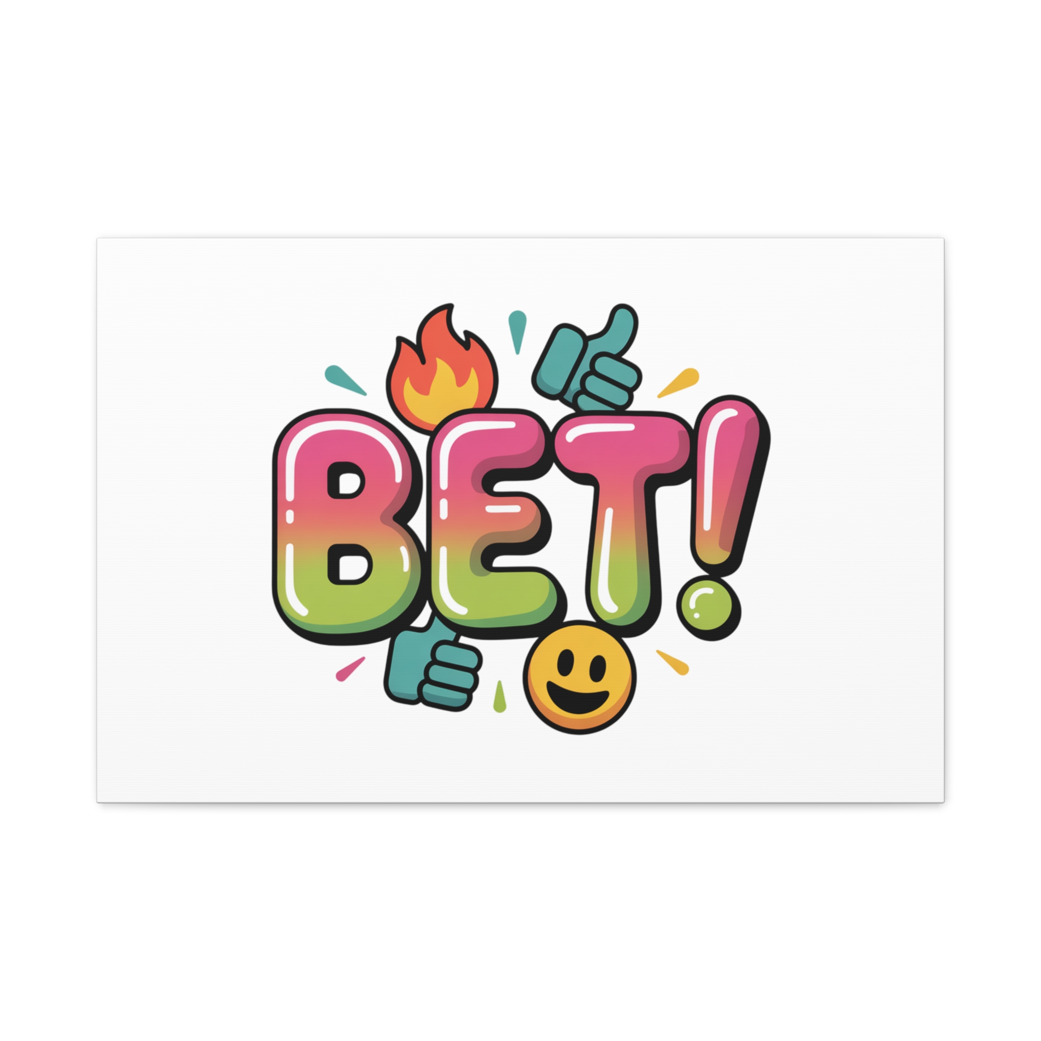 Bright, meme-ready canvas print that reads like a viral reaction sticker — bold, playful typography spells “BET!” with emoji-style accents (flame, thumbs, smile) in a neon-pastel gradient. The artwork channels Gen-Z slang and internet-lingo aesthetics with punchy, screenshot-friendly composition and a casual, social-first vibe that fits creator spaces and dorm walls. Framed on a stretched matte canvas, it brings quick visual humor to streaming backdrops, content corners, or everyday rooms where trend-forward energy matters.