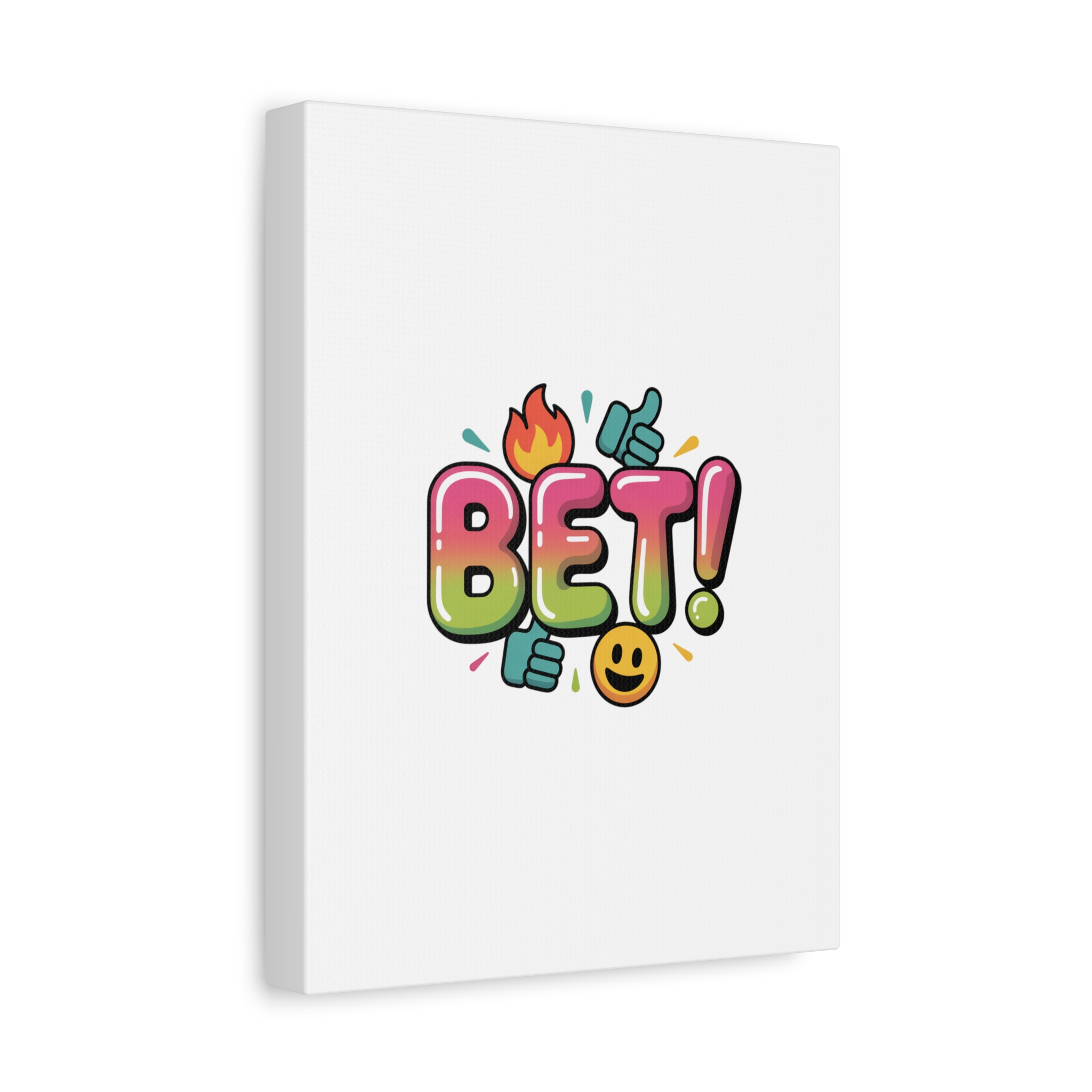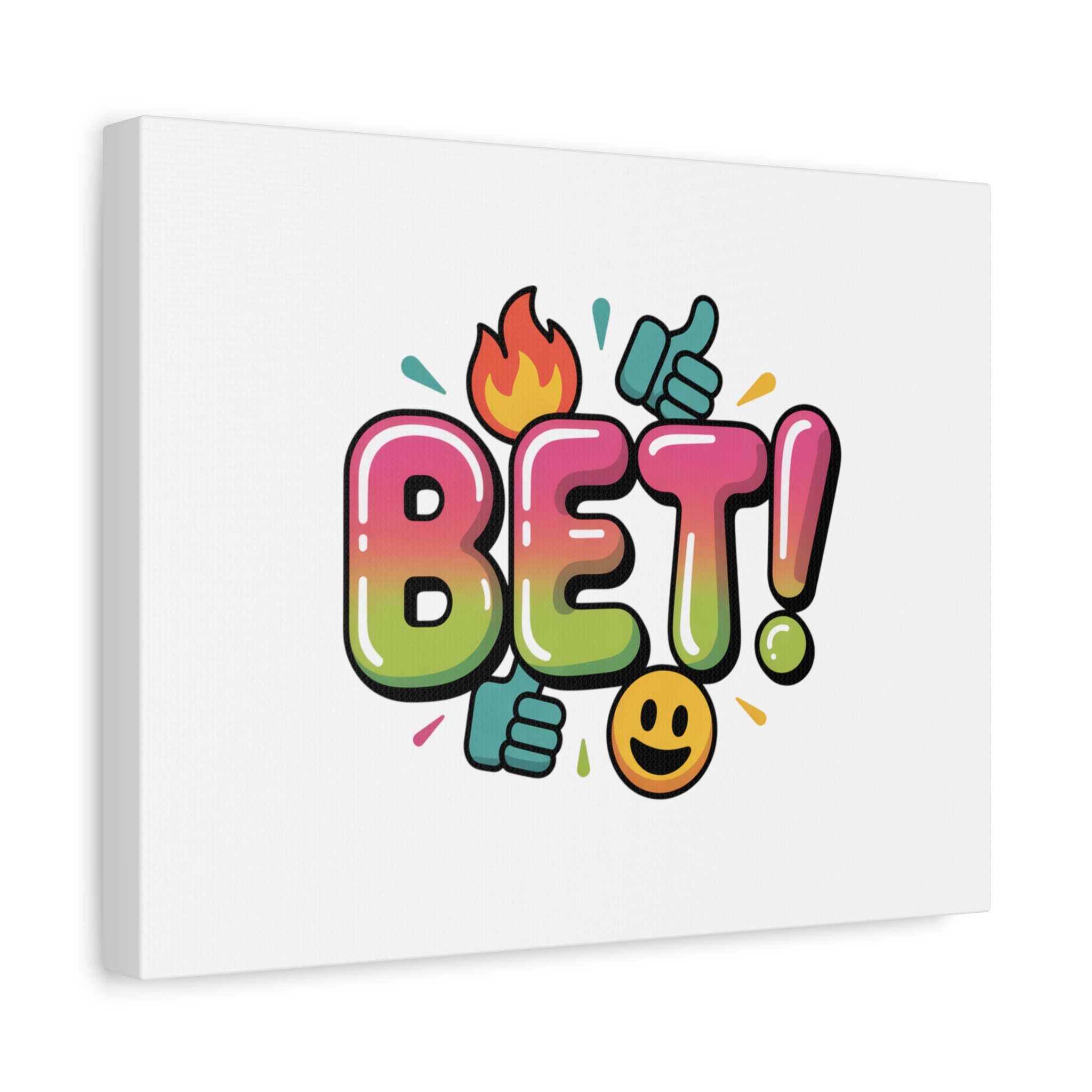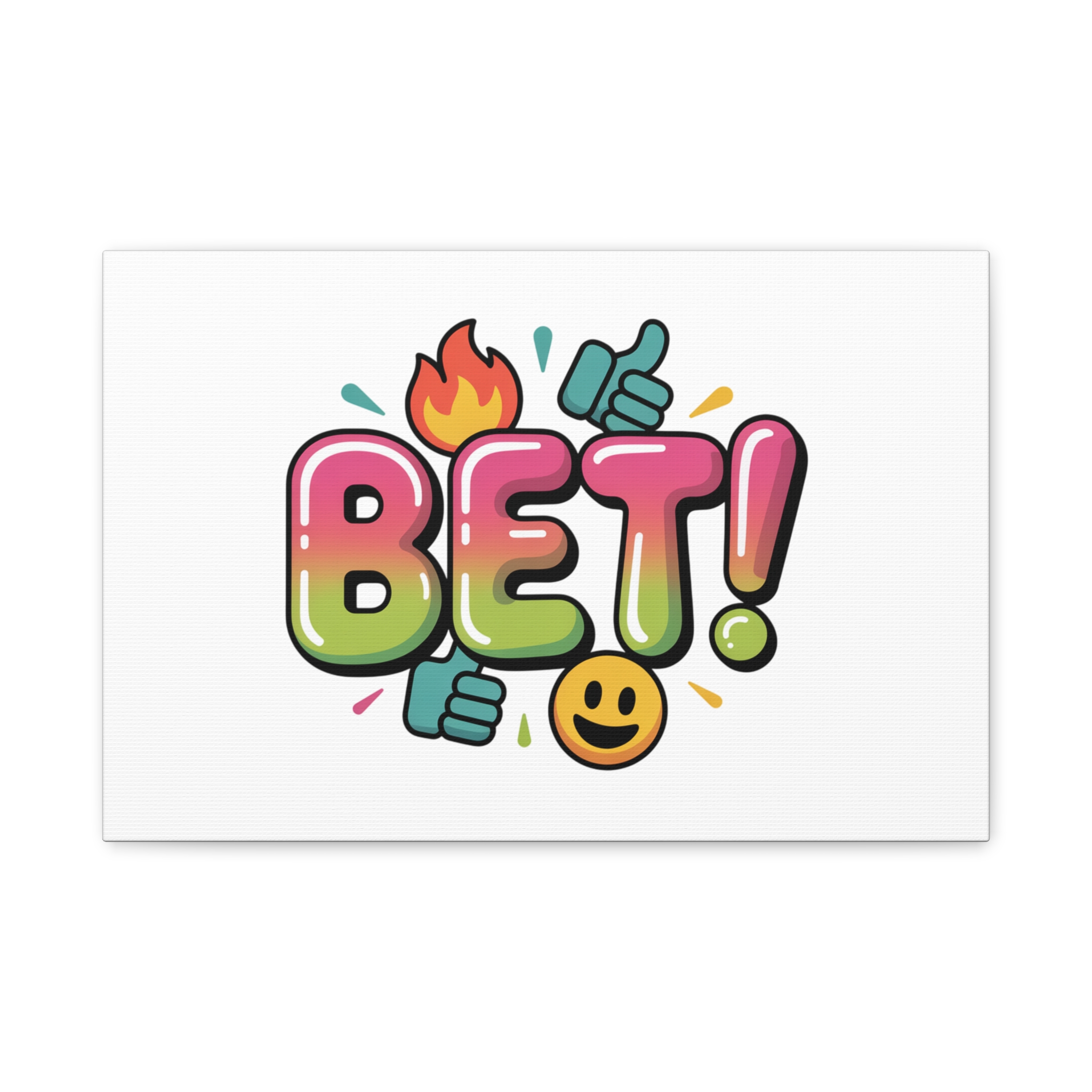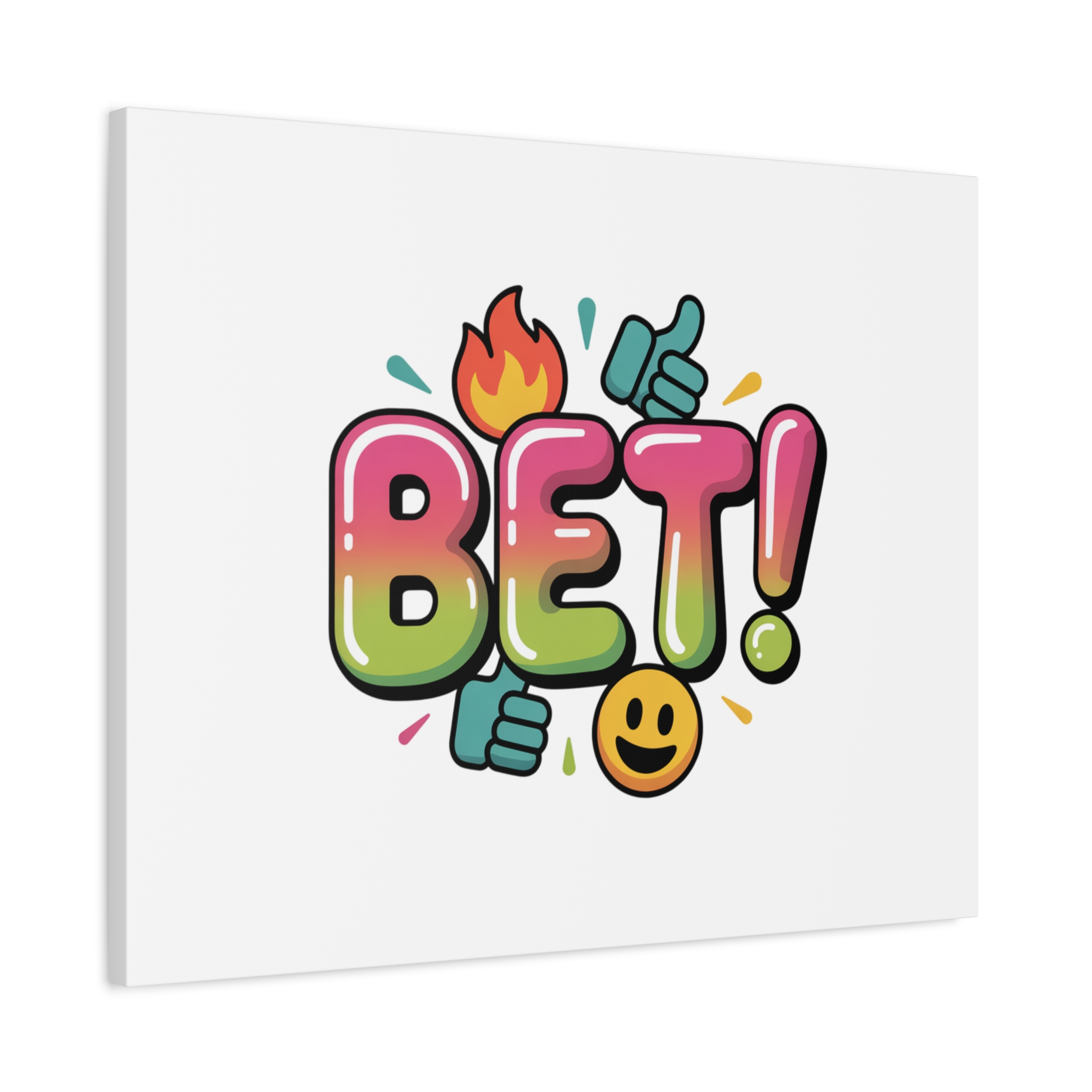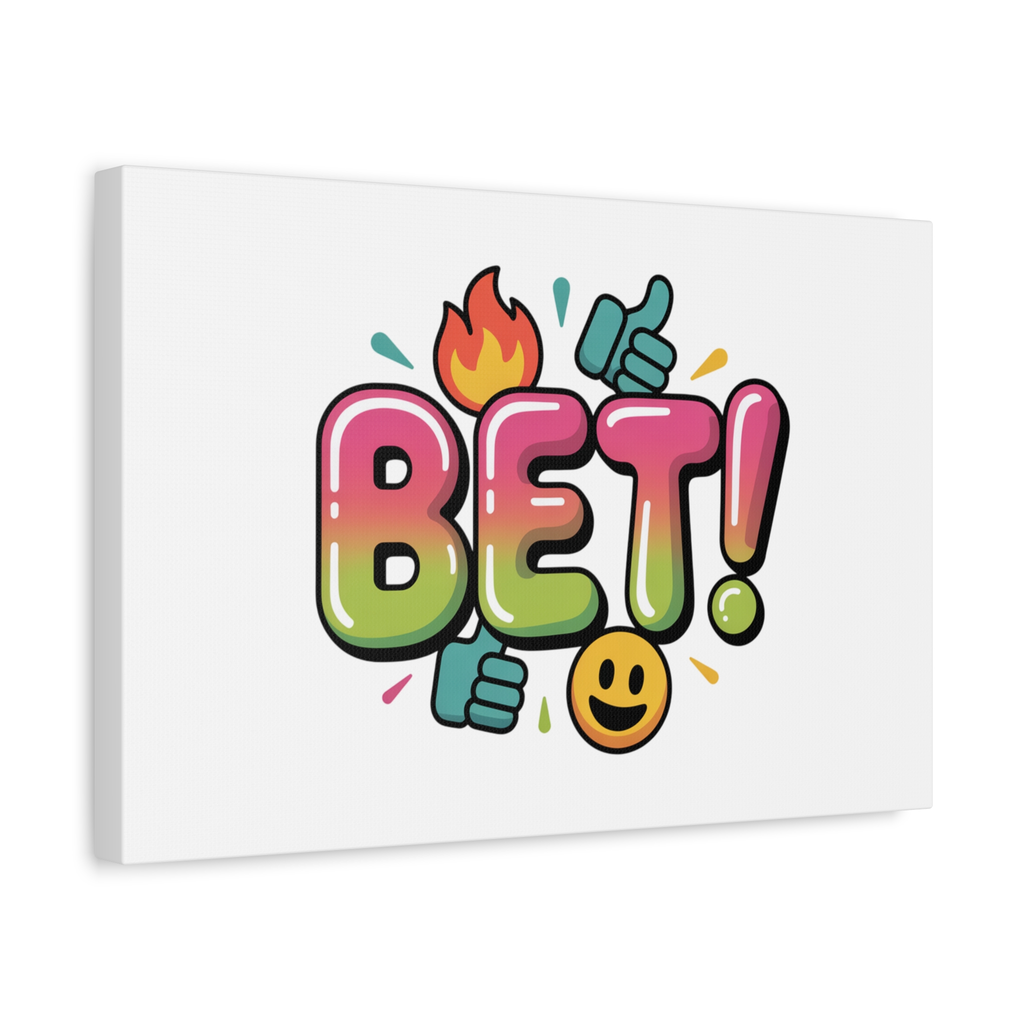 Bright, meme-ready canvas print that reads like a viral reaction sticker — bold, playful typography spells “BET!” with emoji-style accents (flame, thumbs, smile) in a neon-pastel gradient. The artwork channels Gen-Z slang and internet-lingo aesthetics with punchy, screenshot-friendly composition and a casual, social-first vibe that fits creator spaces and dorm walls. Framed on a stretched matte canvas, it brings quick visual humor to streaming backdrops, content corners, or everyday rooms where trend-forward energy matters.