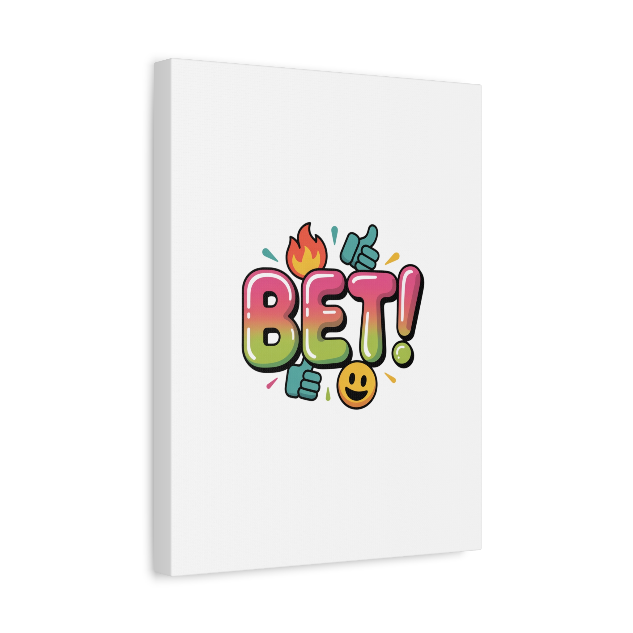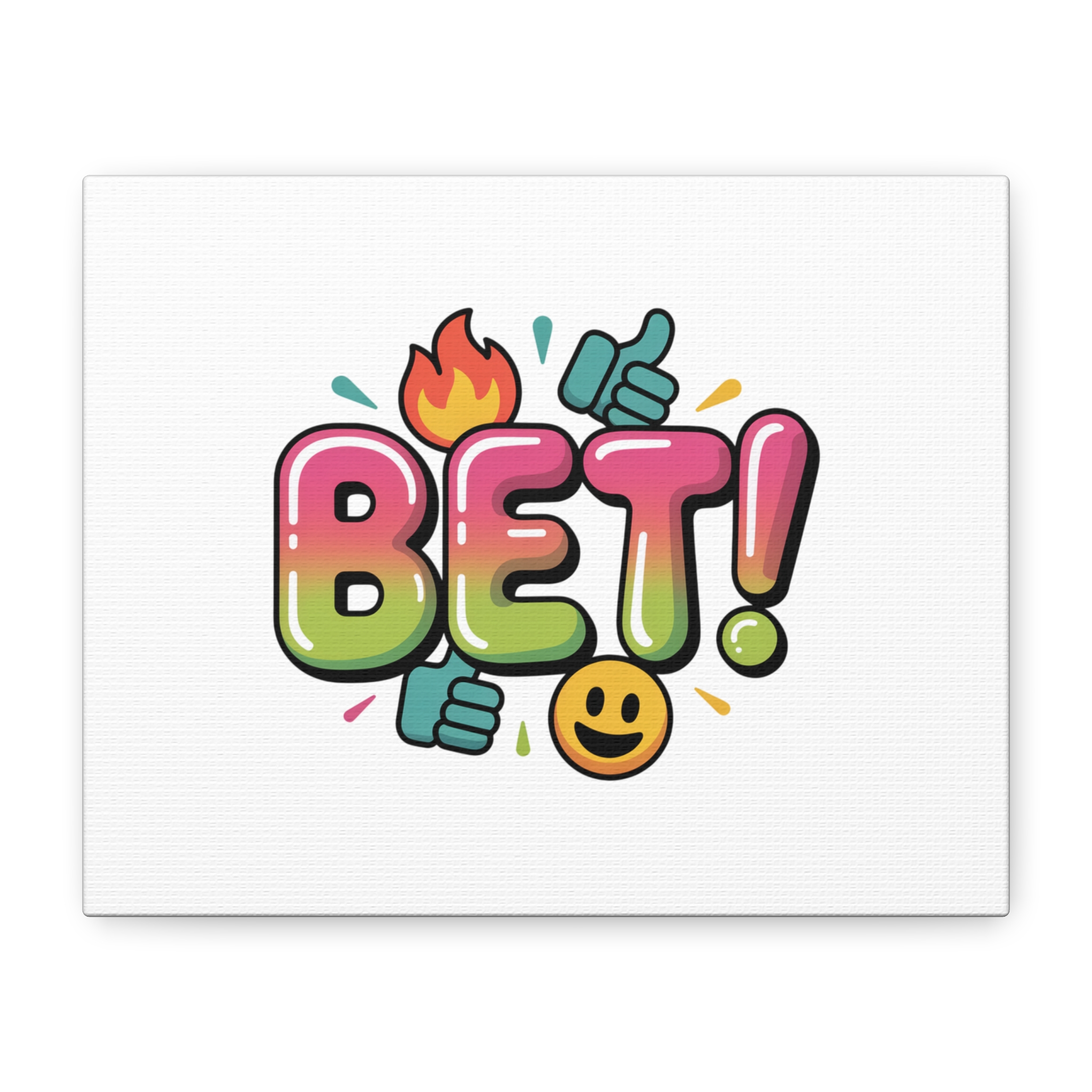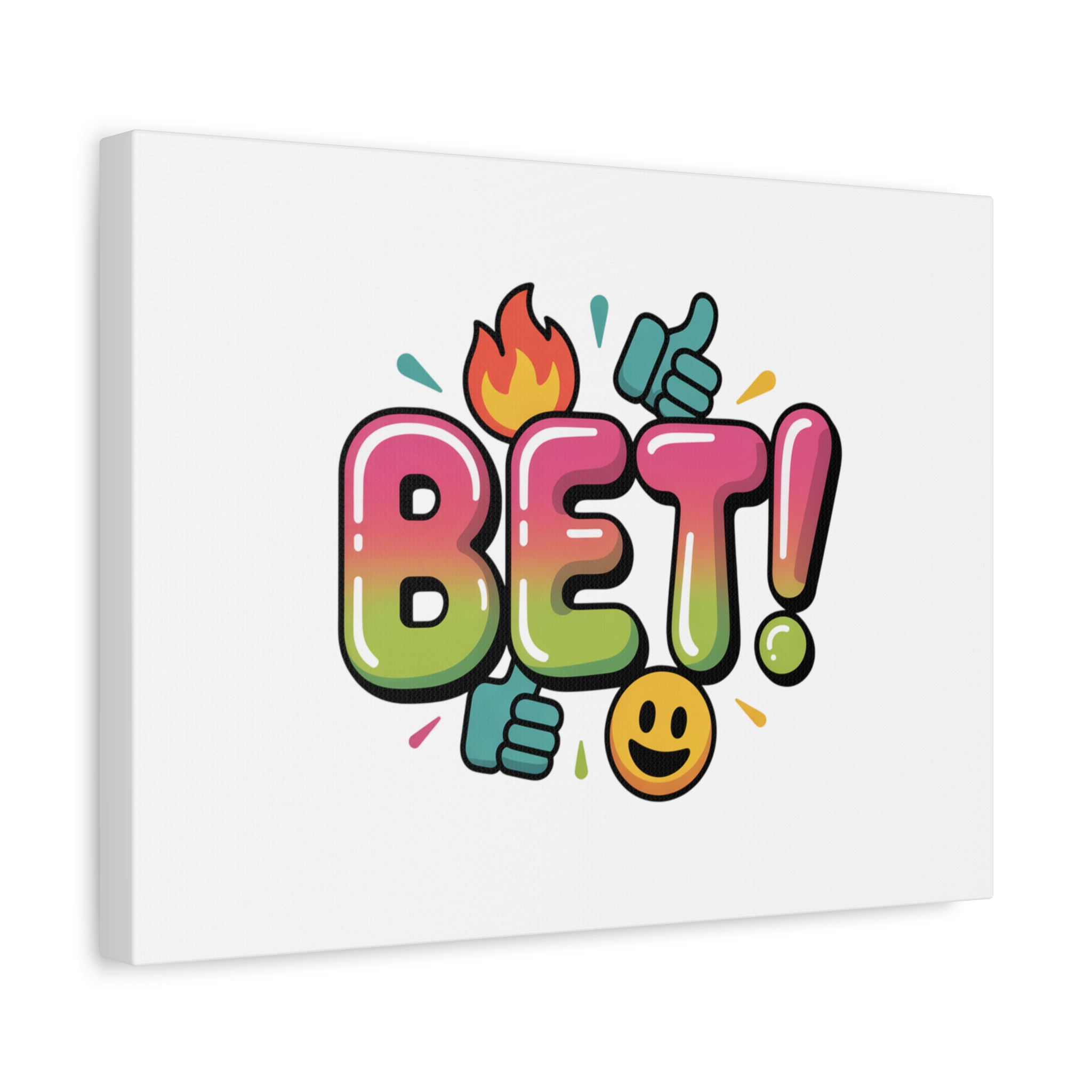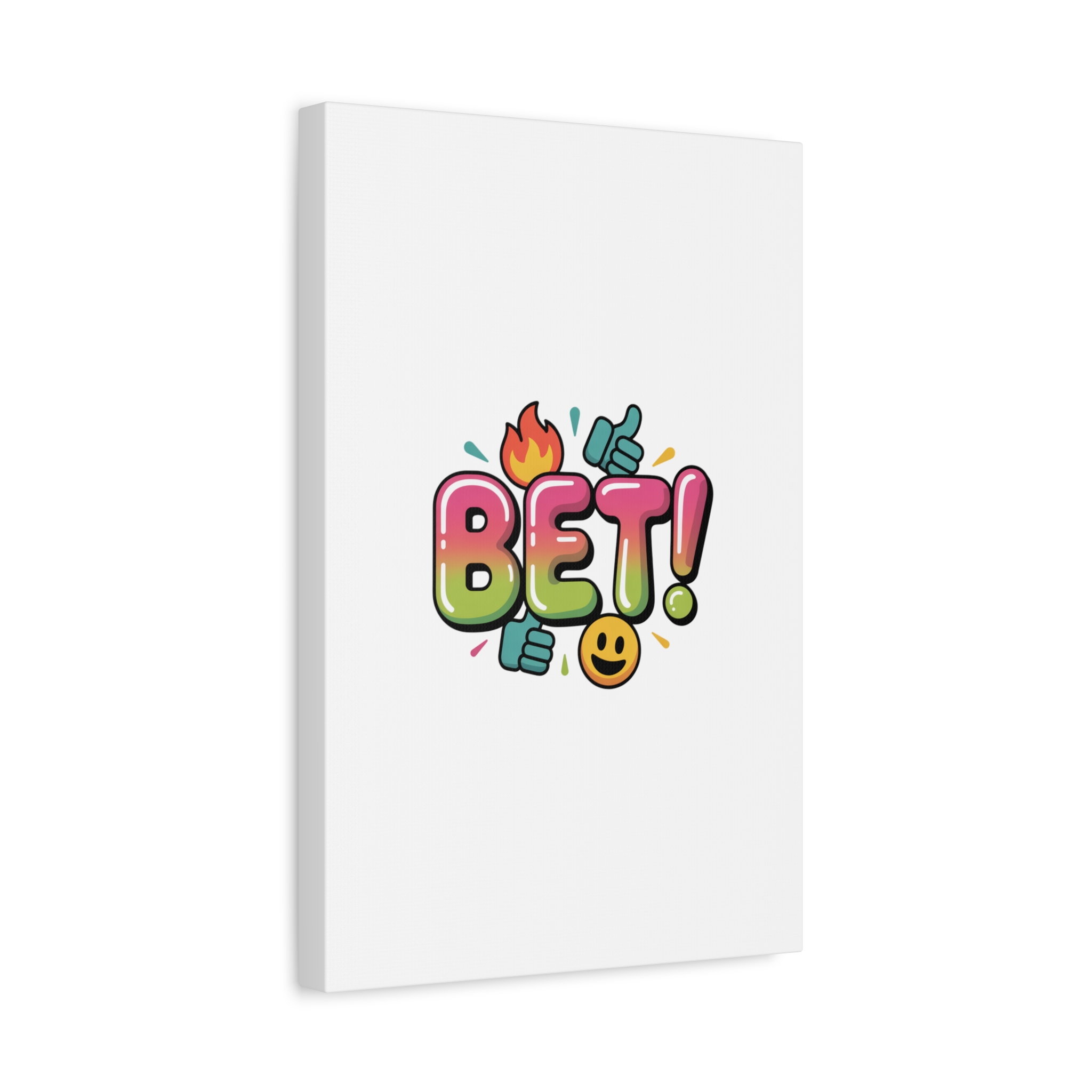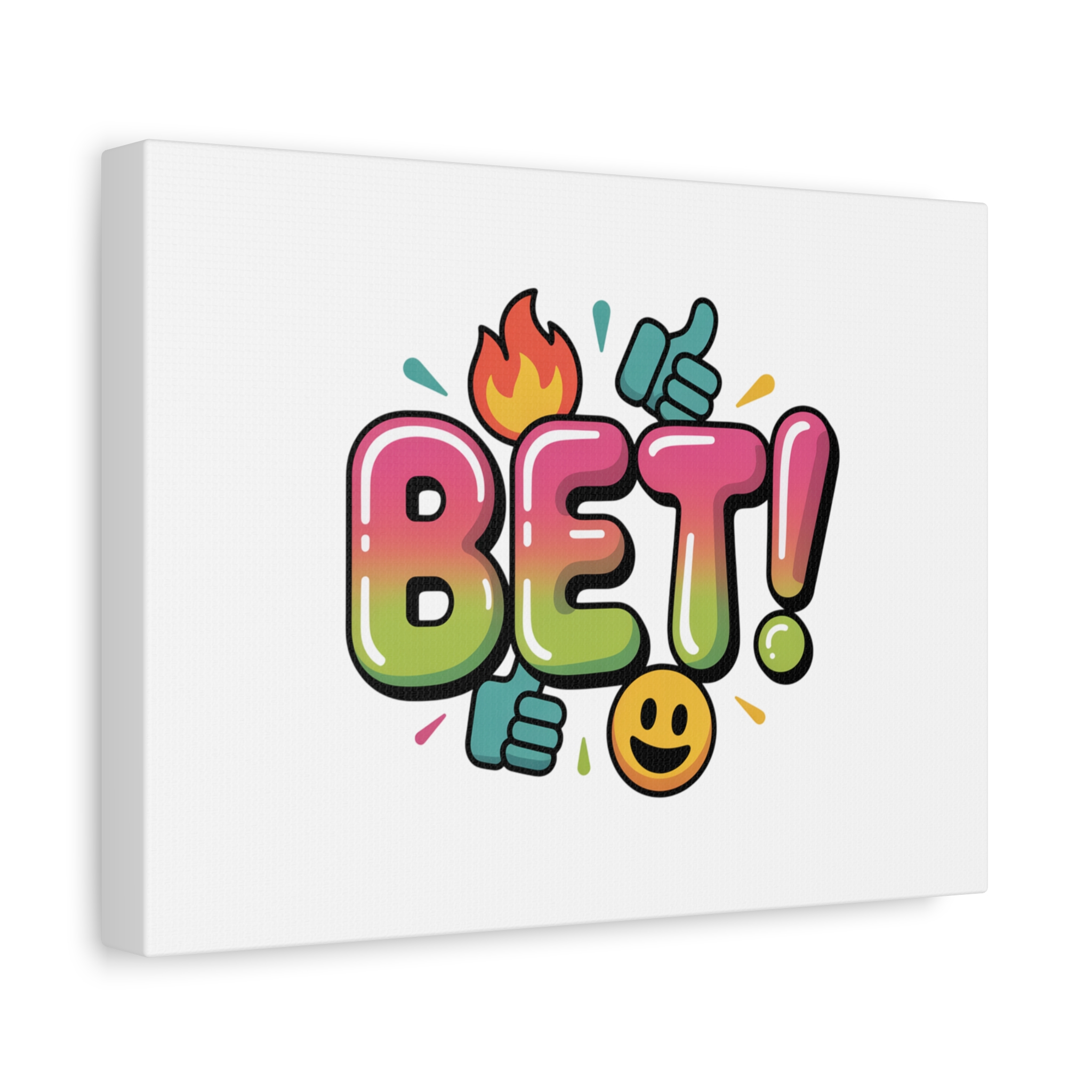 Bright, meme-ready canvas print that reads like a viral reaction sticker — bold, playful typography spells “BET!” with emoji-style accents (flame, thumbs, smile) in a neon-pastel gradient. The artwork channels Gen-Z slang and internet-lingo aesthetics with punchy, screenshot-friendly composition and a casual, social-first vibe that fits creator spaces and dorm walls. Framed on a stretched matte canvas, it brings quick visual humor to streaming backdrops, content corners, or everyday rooms where trend-forward energy matters.