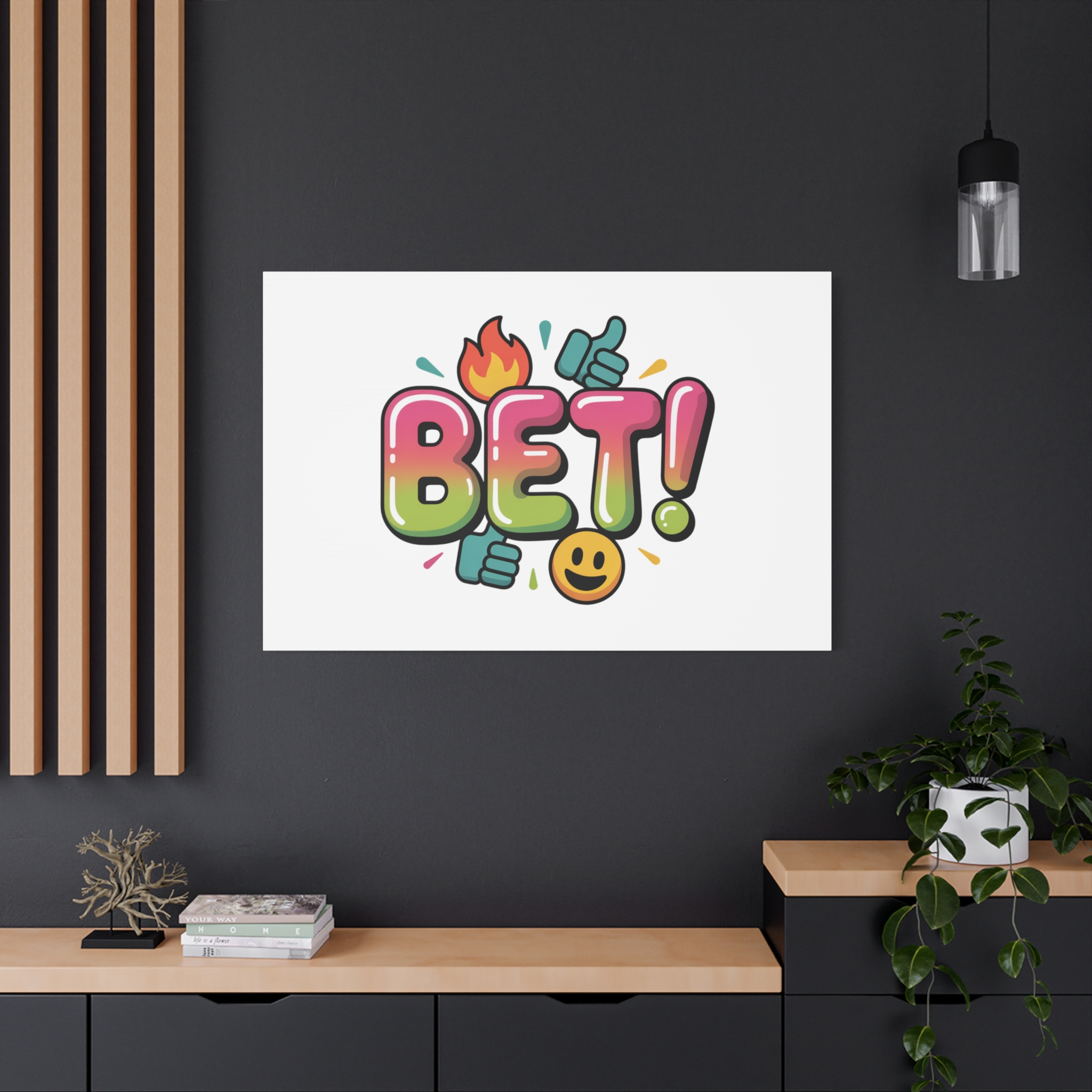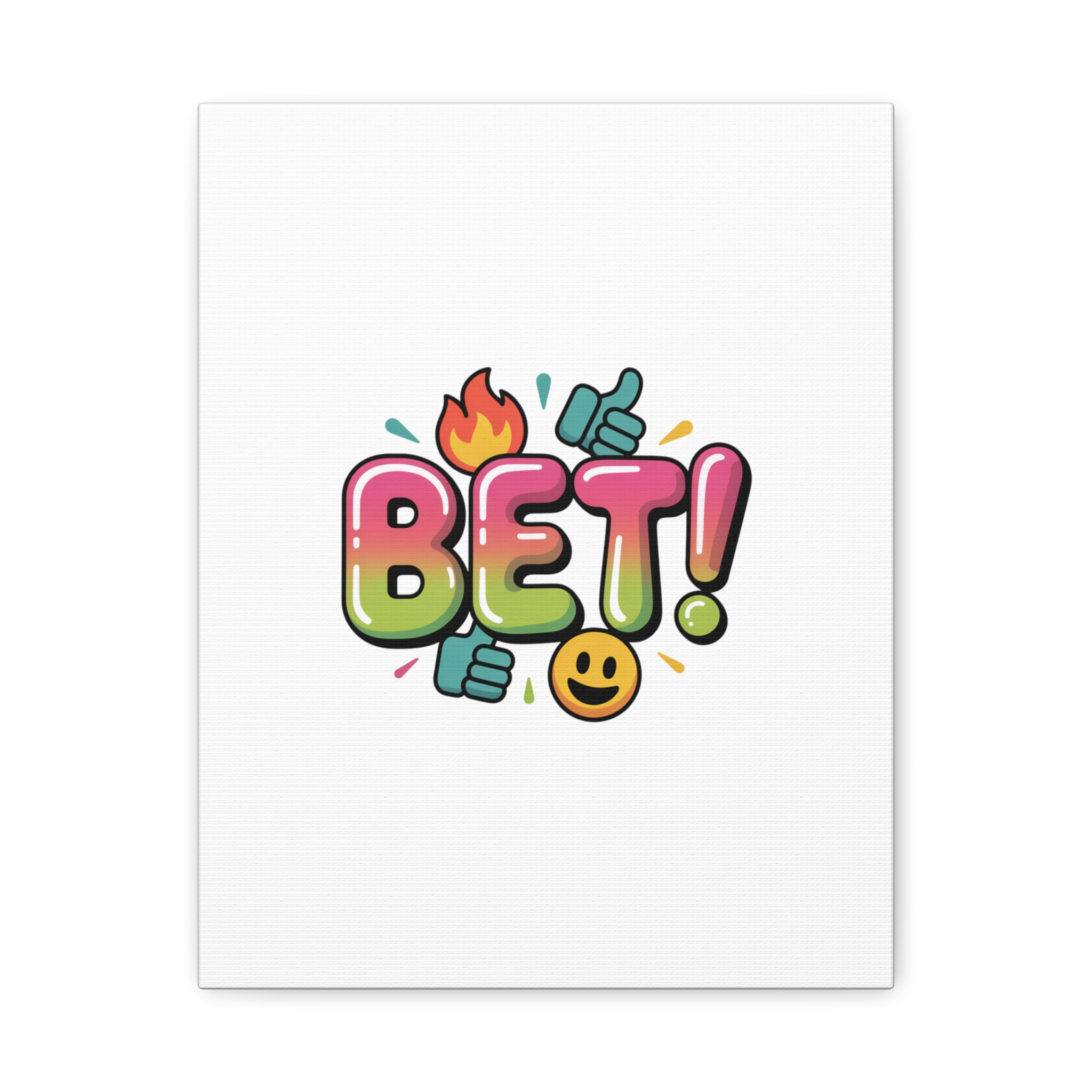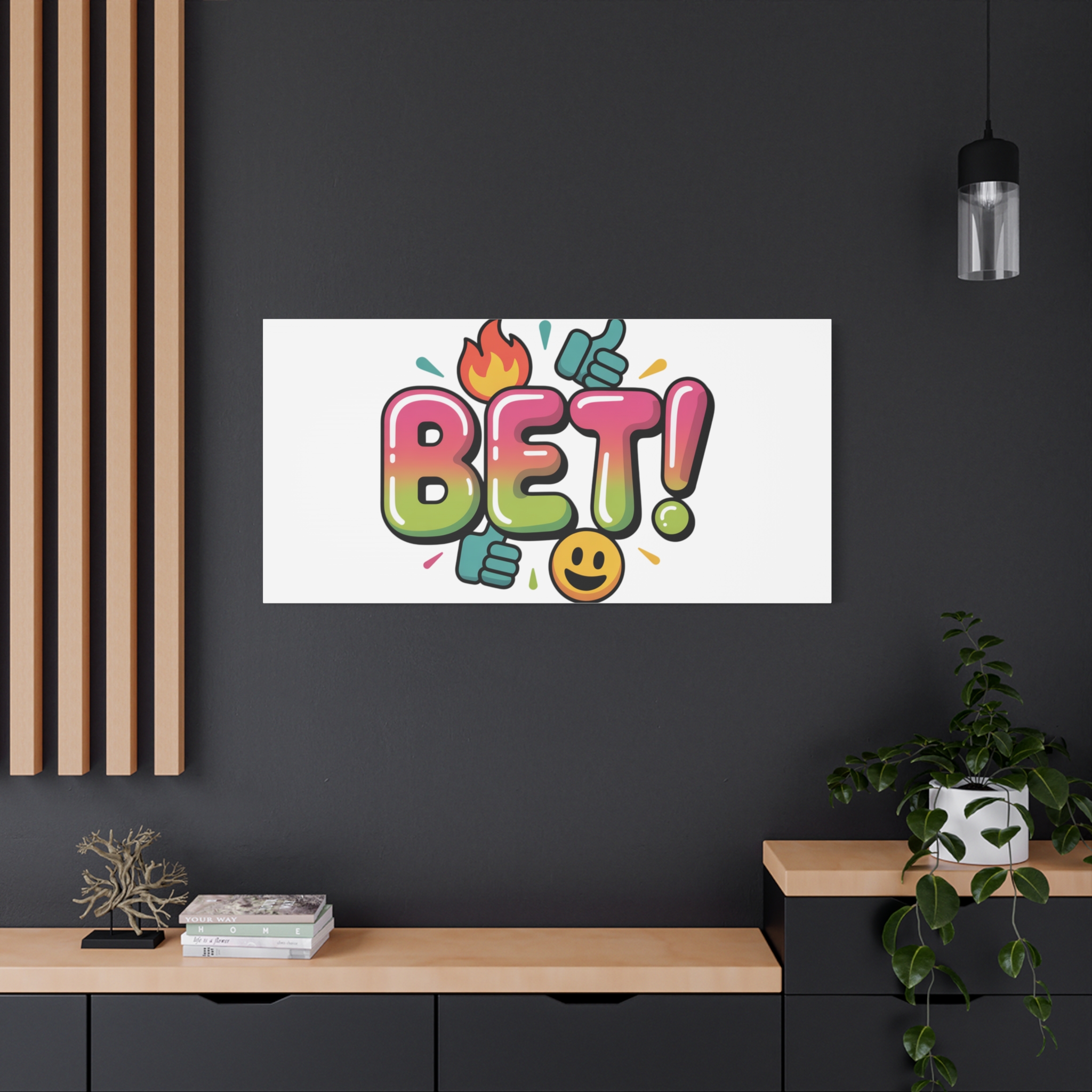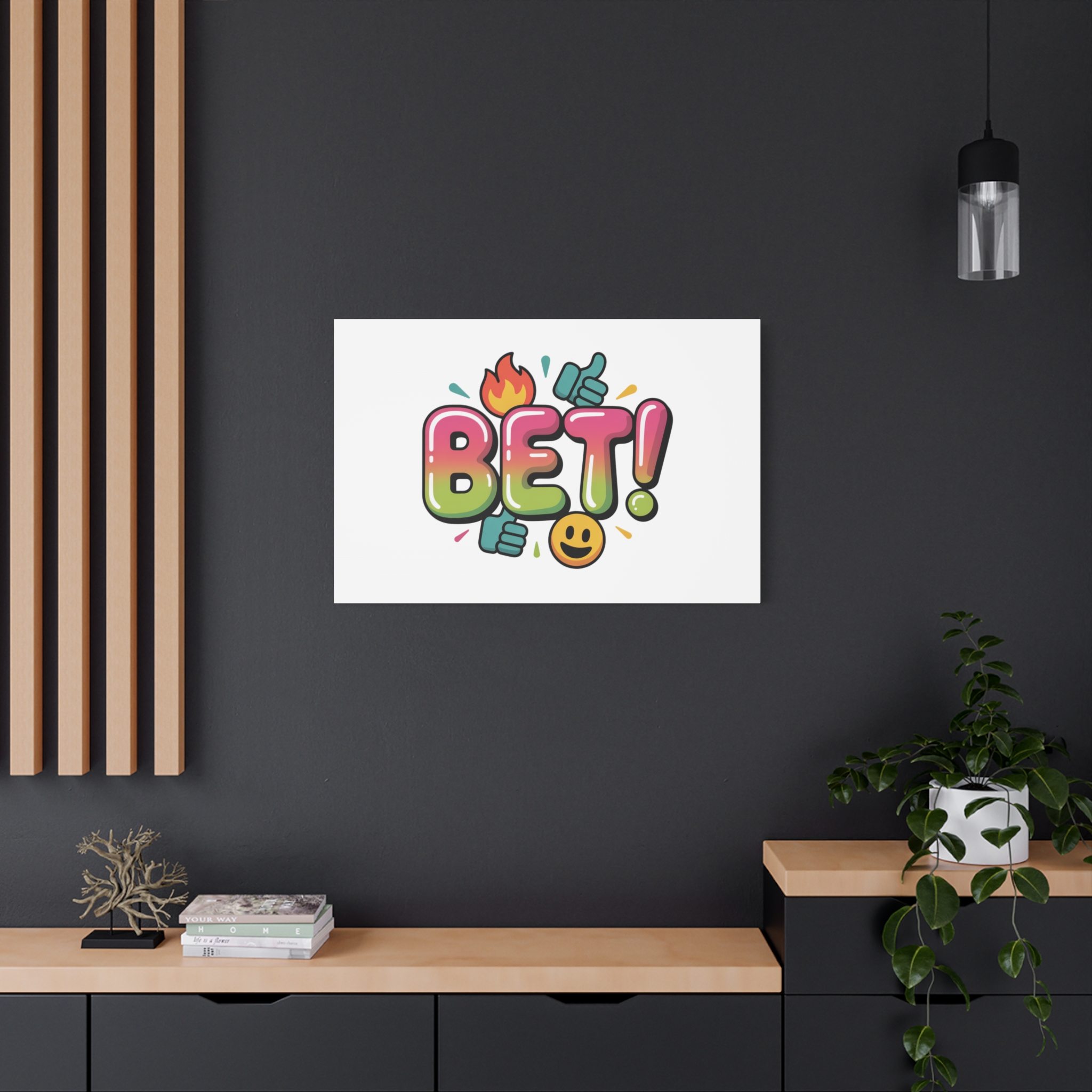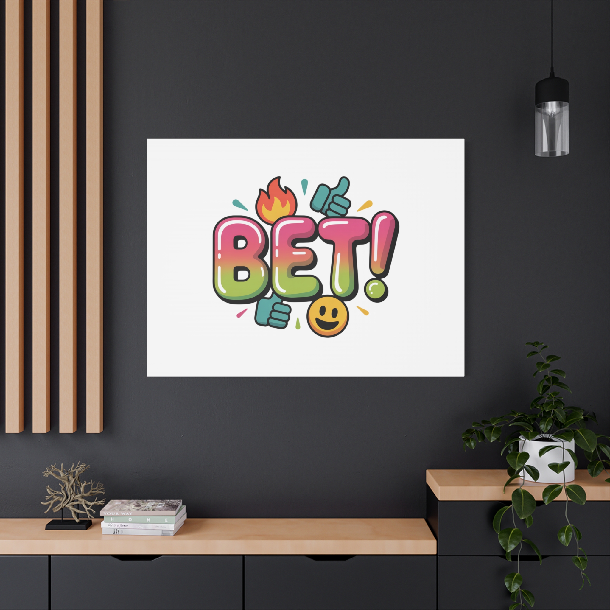 Bright, meme-ready canvas print that reads like a viral reaction sticker — bold, playful typography spells “BET!” with emoji-style accents (flame, thumbs, smile) in a neon-pastel gradient. The artwork channels Gen-Z slang and internet-lingo aesthetics with punchy, screenshot-friendly composition and a casual, social-first vibe that fits creator spaces and dorm walls. Framed on a stretched matte canvas, it brings quick visual humor to streaming backdrops, content corners, or everyday rooms where trend-forward energy matters.