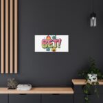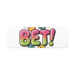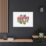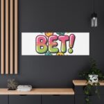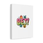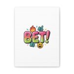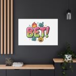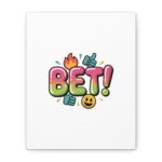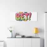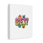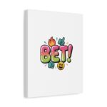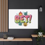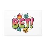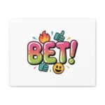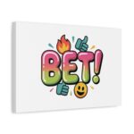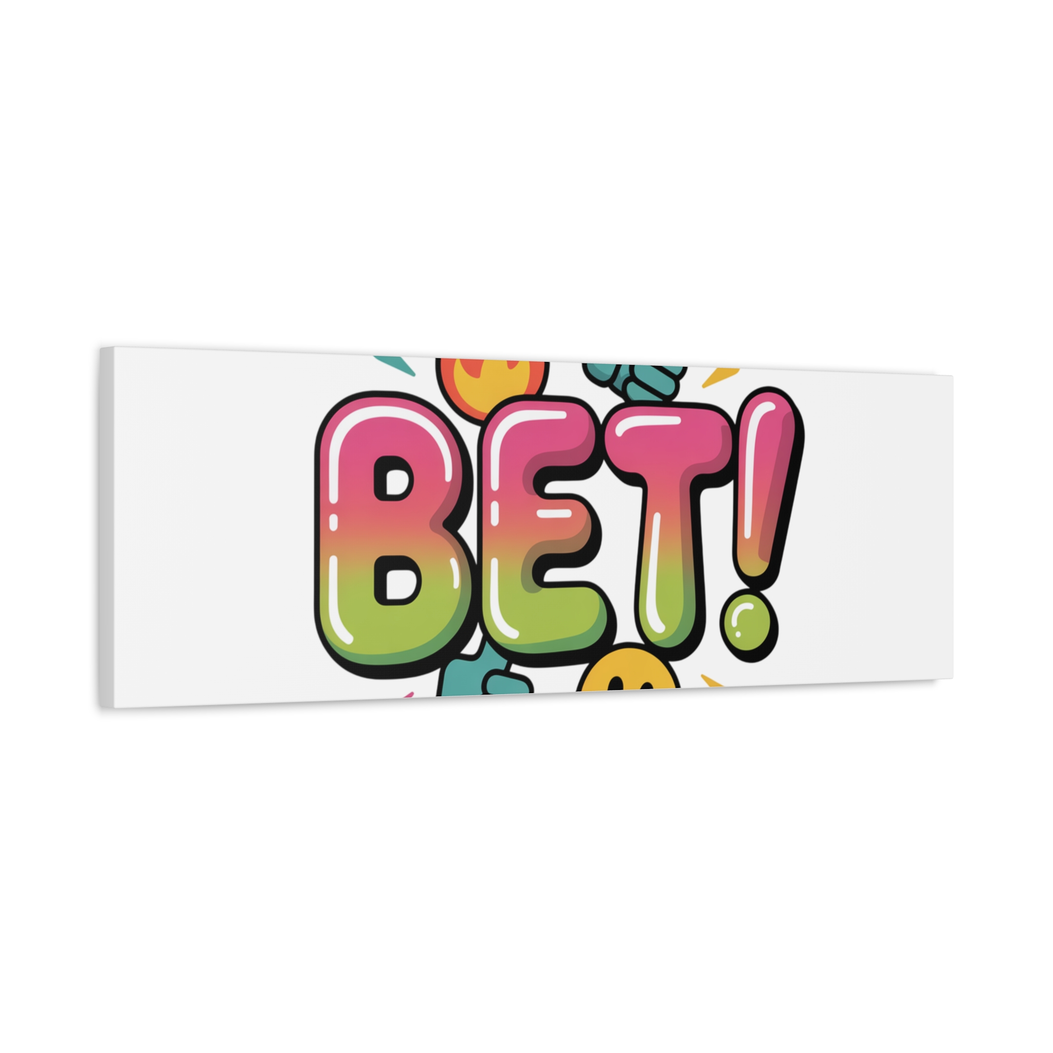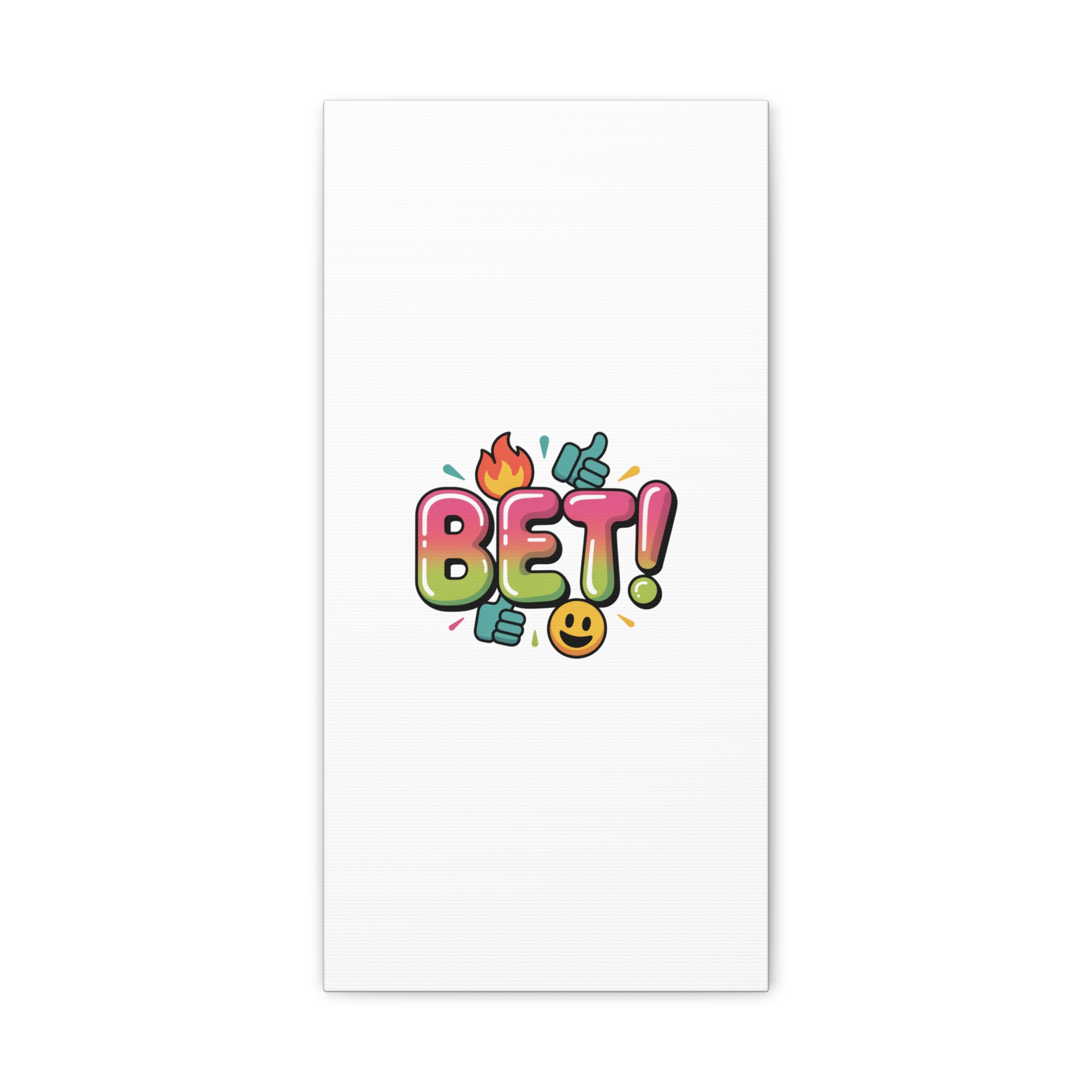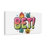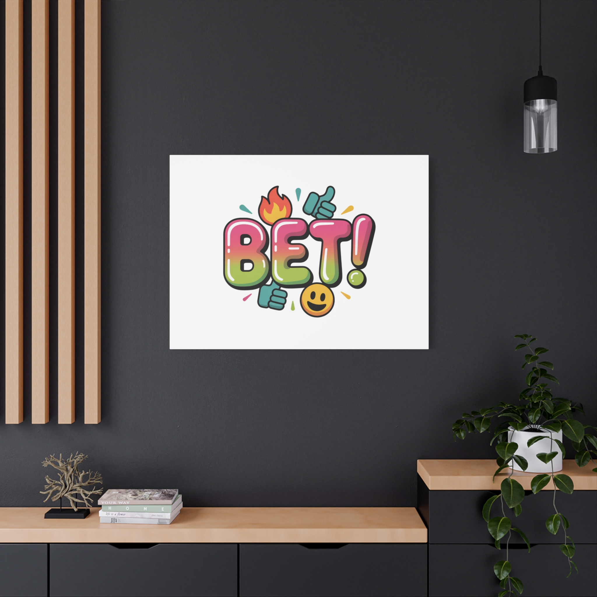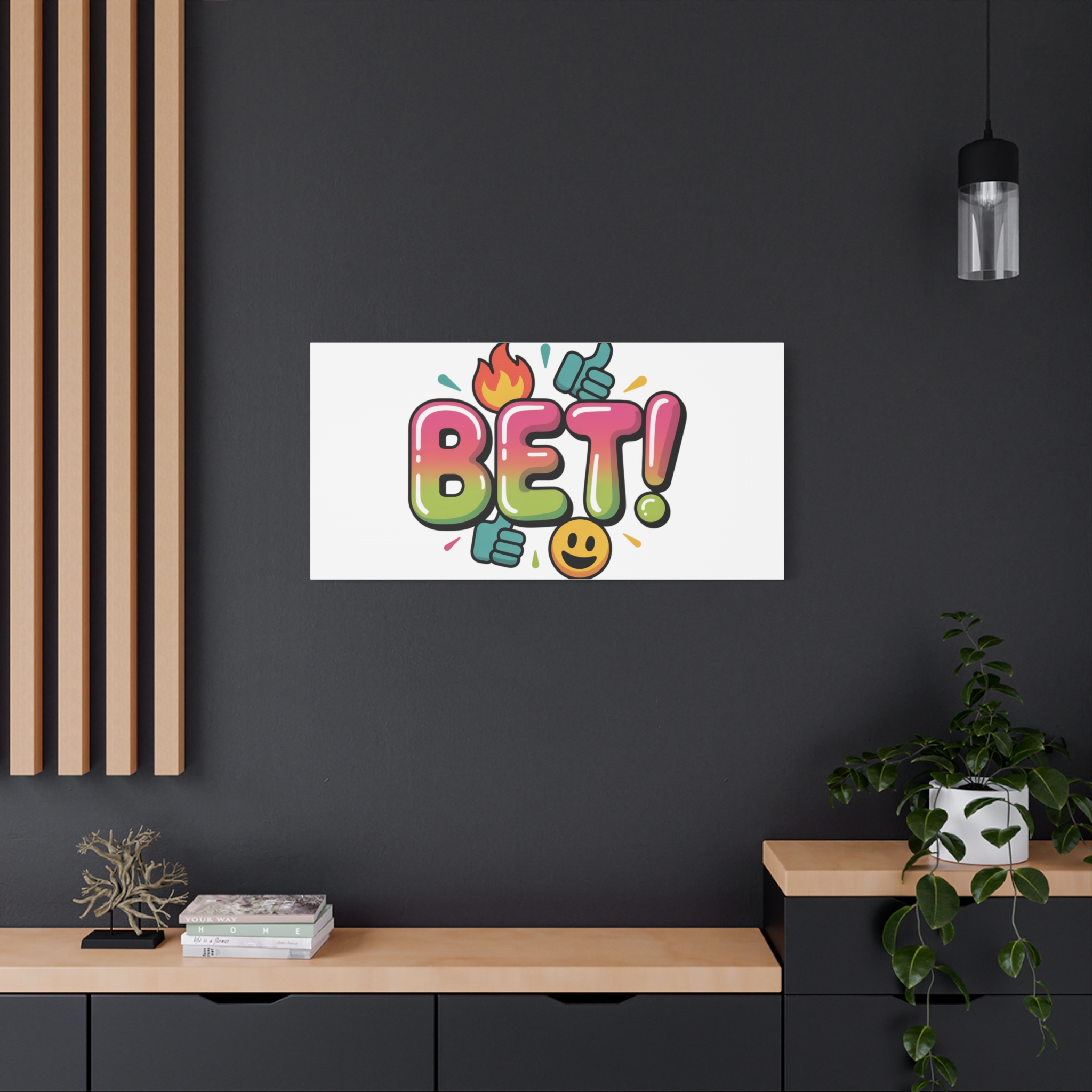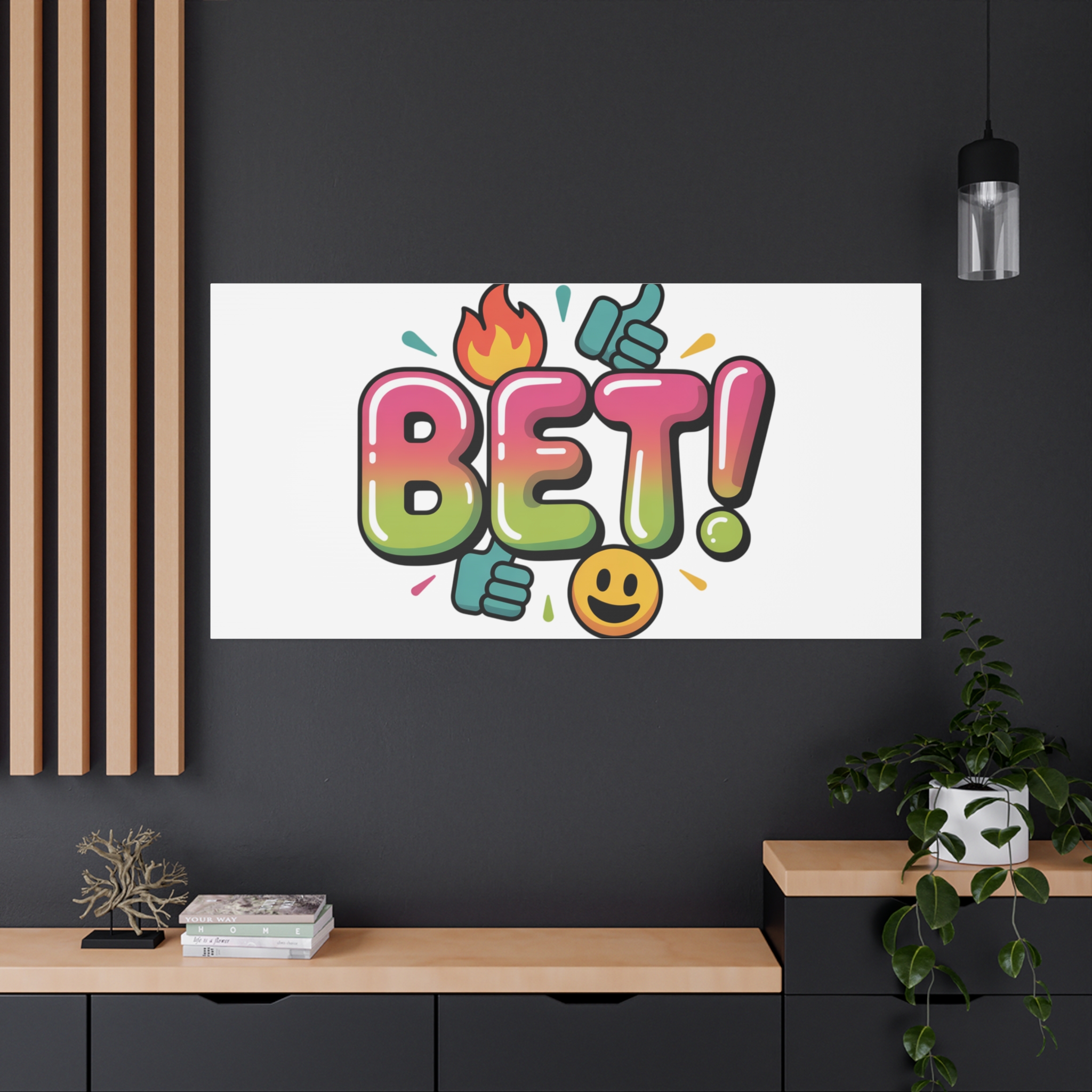 Bright, meme-ready canvas print that reads like a viral reaction sticker — bold, playful typography spells “BET!” with emoji-style accents (flame, thumbs, smile) in a neon-pastel gradient. The artwork channels Gen-Z slang and internet-lingo aesthetics with punchy, screenshot-friendly composition and a casual, social-first vibe that fits creator spaces and dorm walls. Framed on a stretched matte canvas, it brings quick visual humor to streaming backdrops, content corners, or everyday rooms where trend-forward energy matters.