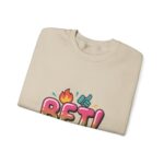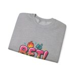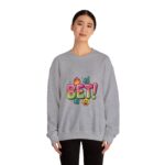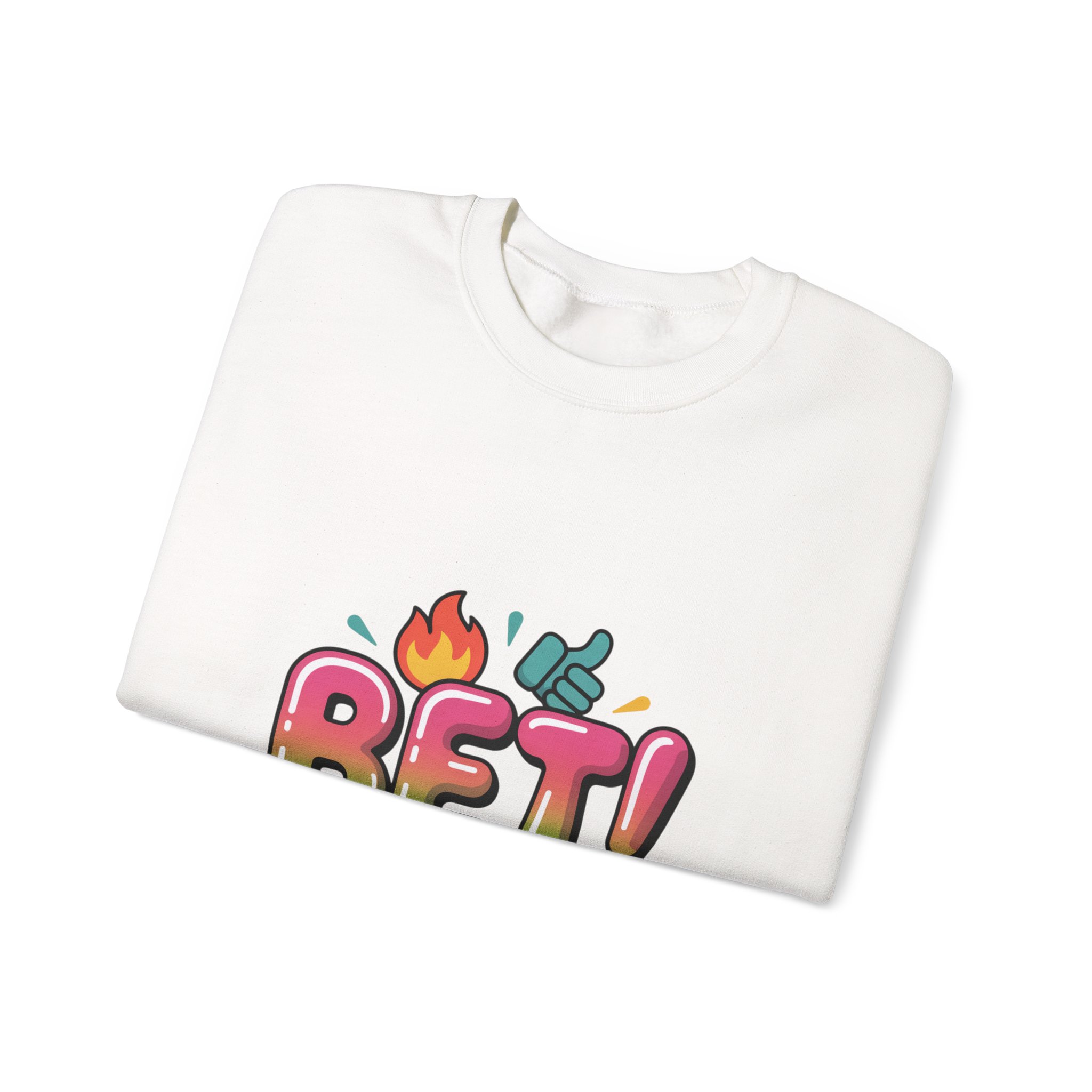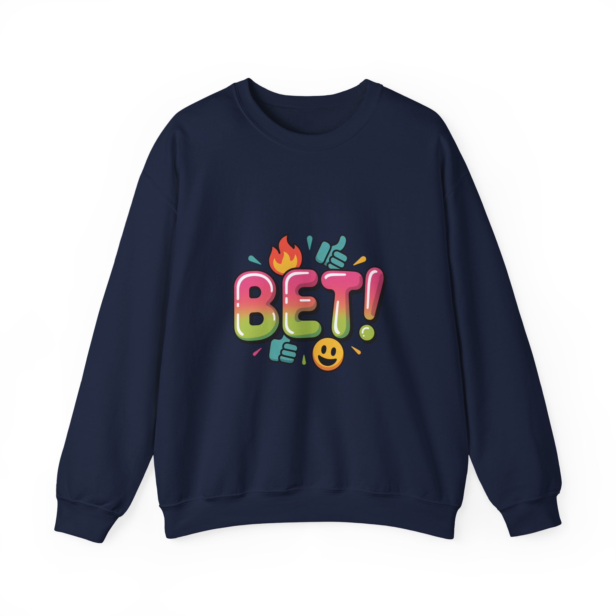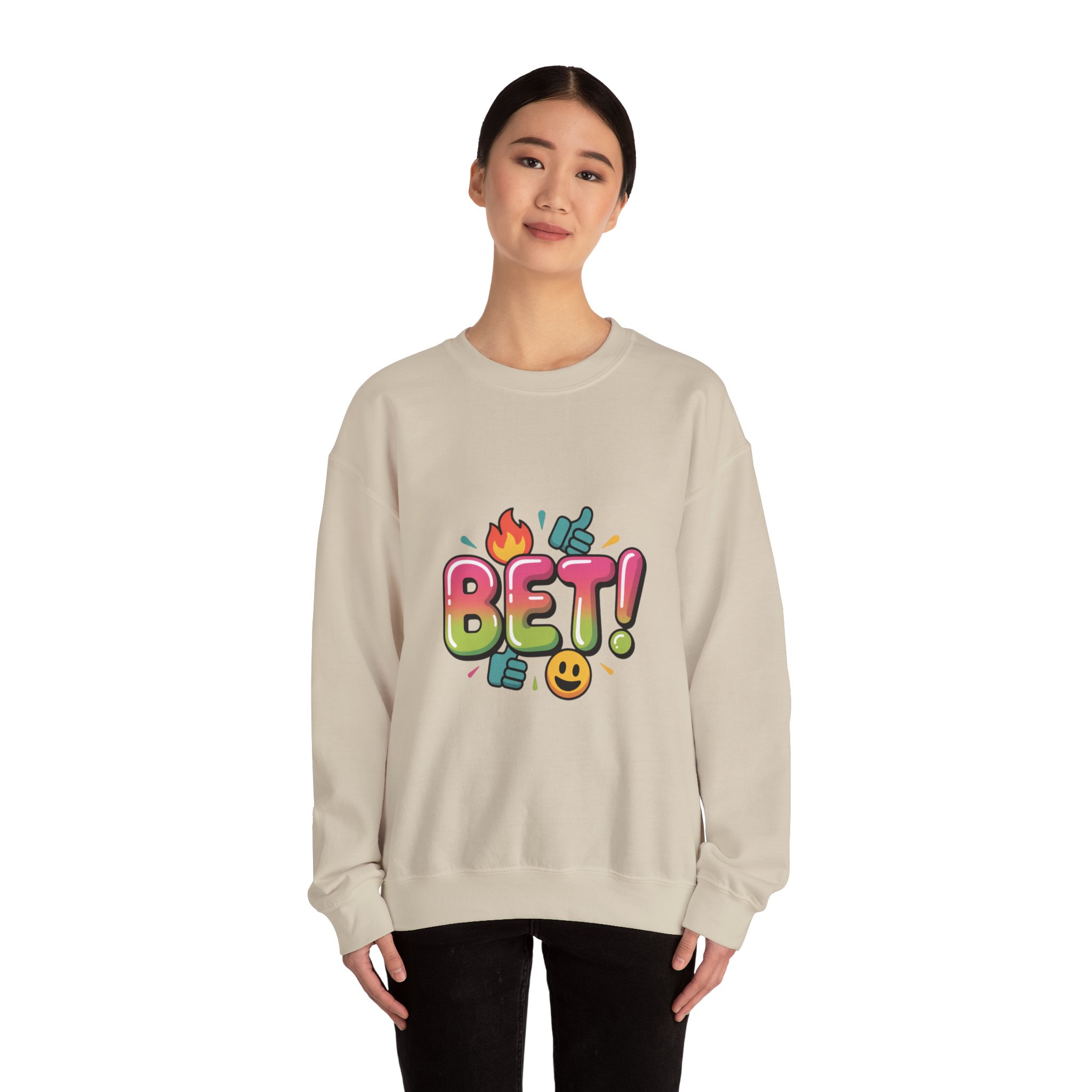 Bold, playful crewneck sweatshirt featuring a colorful, meme-adjacent “BET!” graphic with emoji-style icons and glossy, rounded typography that taps into Gen‑Z slang and internet-lingo vibes. The artwork reads like a screenshot-ready caption — bright, readable, and built for shareable moments. Its casual, social-first energy suits creators and trend-savvy shoppers who layer witty text pieces into everyday outfits.