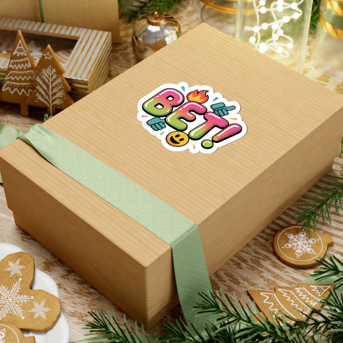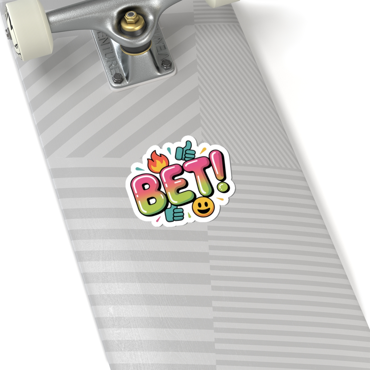 Playful, screenshot-ready kiss-cut sticker that channels Gen-Z slang with bold, bubbled typography and emoji accents. The word “BET!” pops in a glossy, gradient fill with thumb-up icons, a tiny flame and a smiling emoji—a bright, meme-driven vibe made to layer onto laptops, journals, or phone cases. Its punchy layout and internet-lingo energy fit creators and trend-chasers who add quick, relatable visual cues to their gear.