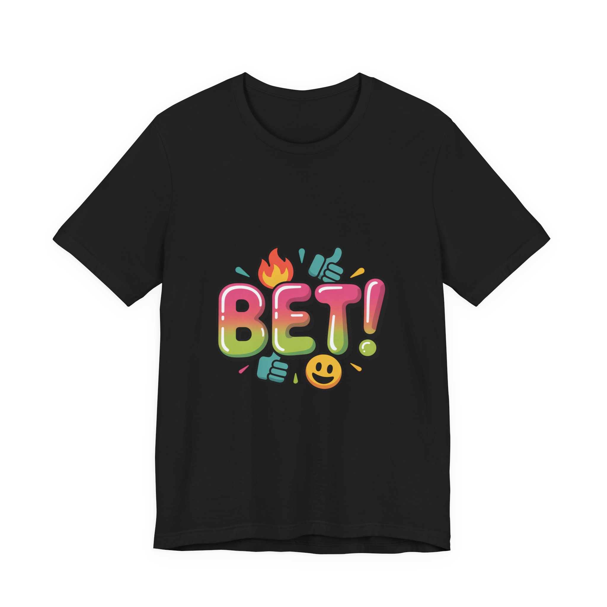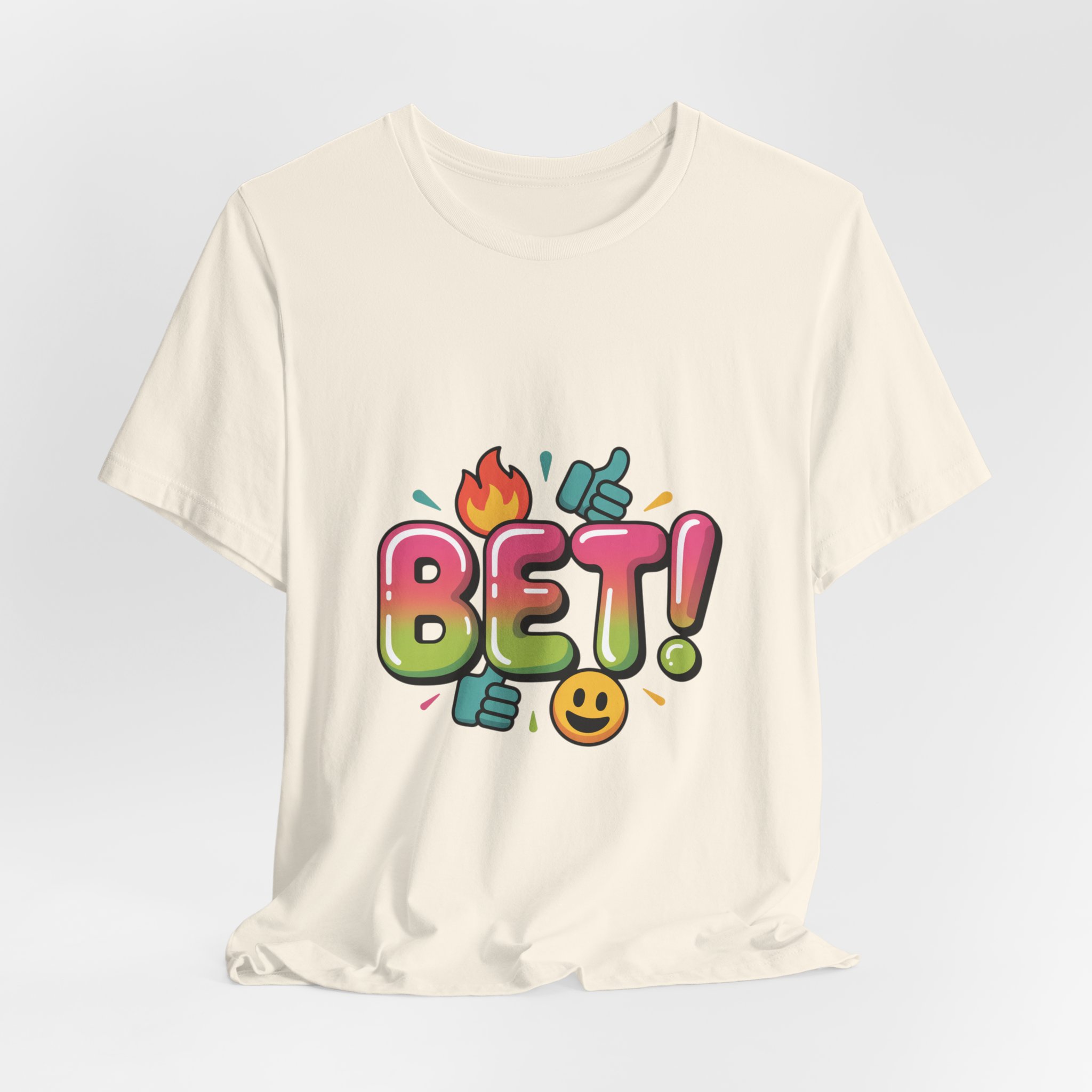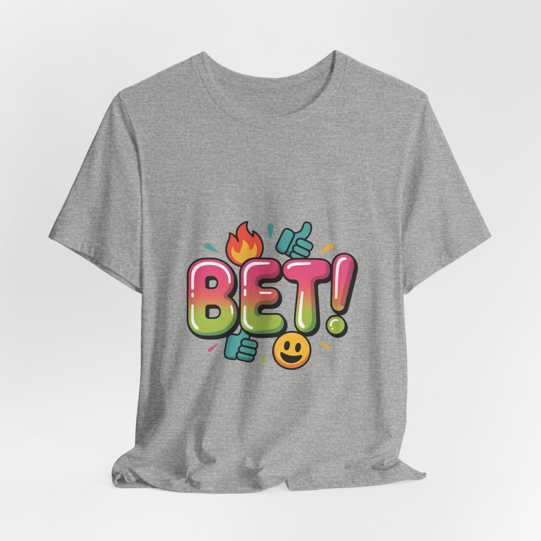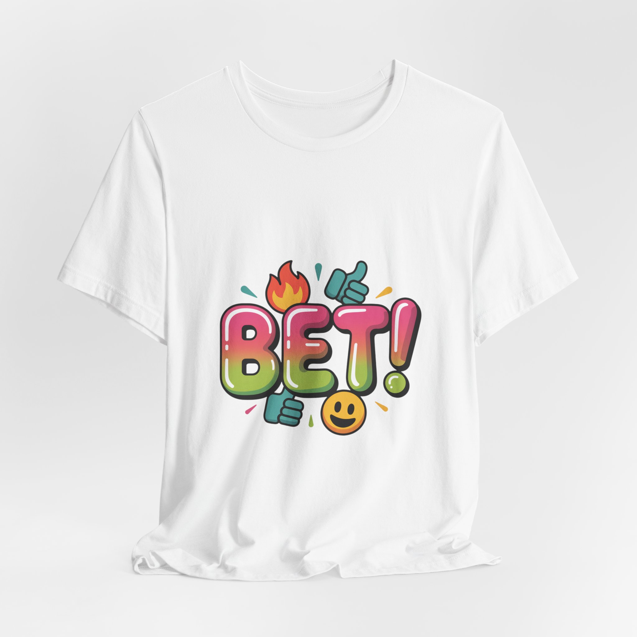 Bright, sticker-like “BET!” graphic in bubbly, meme-ready lettering—a Gen‑Z slang tee that reads like a playful chat reaction. The colorful, gradient-filled text with emoji and hand icons leans into internet-lingo aesthetics, offering a fun, social-first vibe for creators and trend-savvy shoppers who want a quick, scannable statement in their feed. Lightweight and casually cut, it layers easily under jackets or pairs with streetwear for everyday content creation and hangouts.