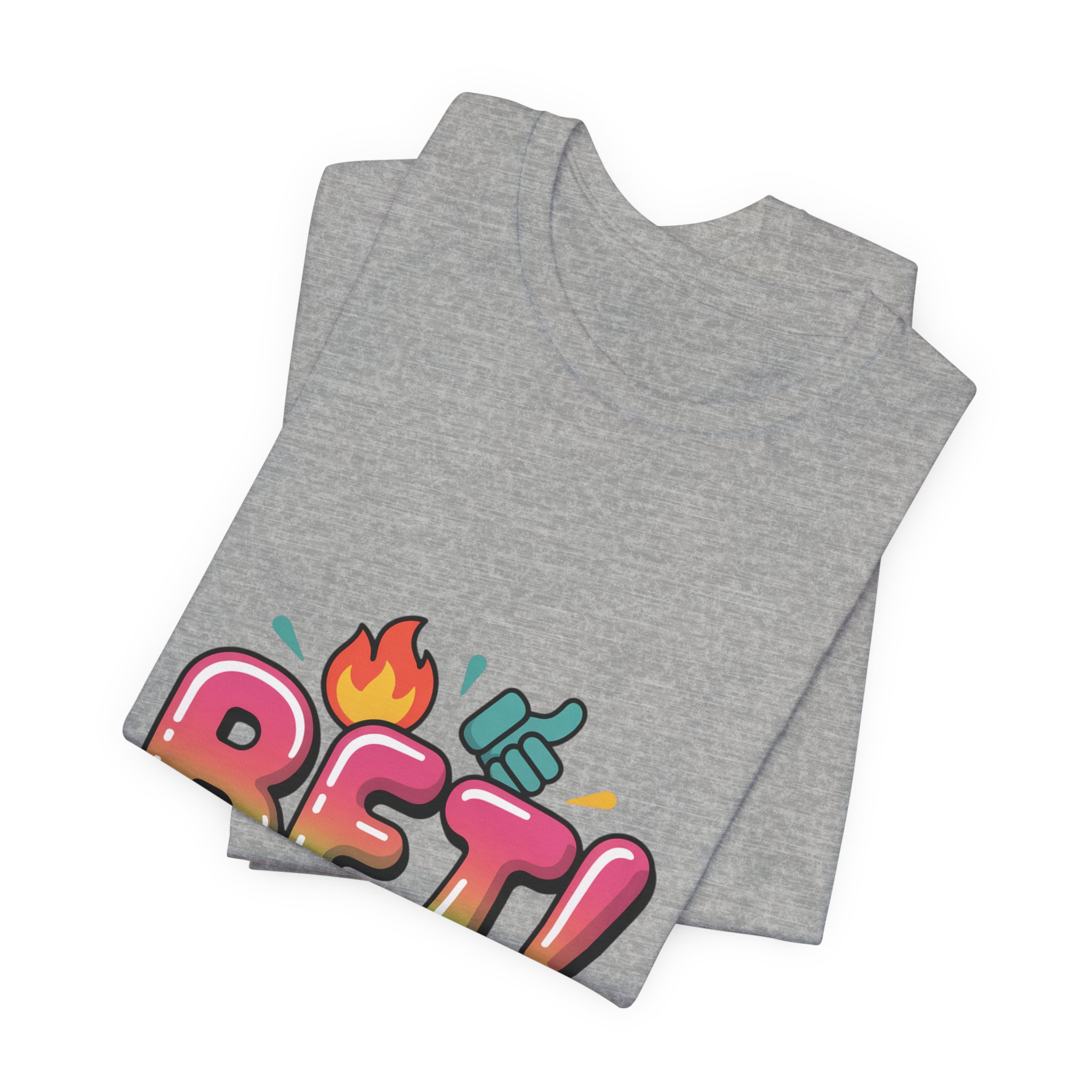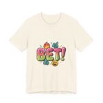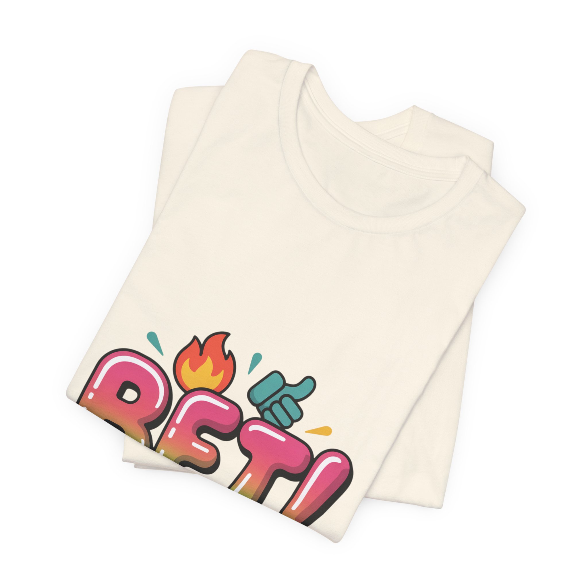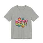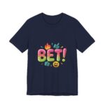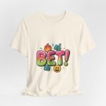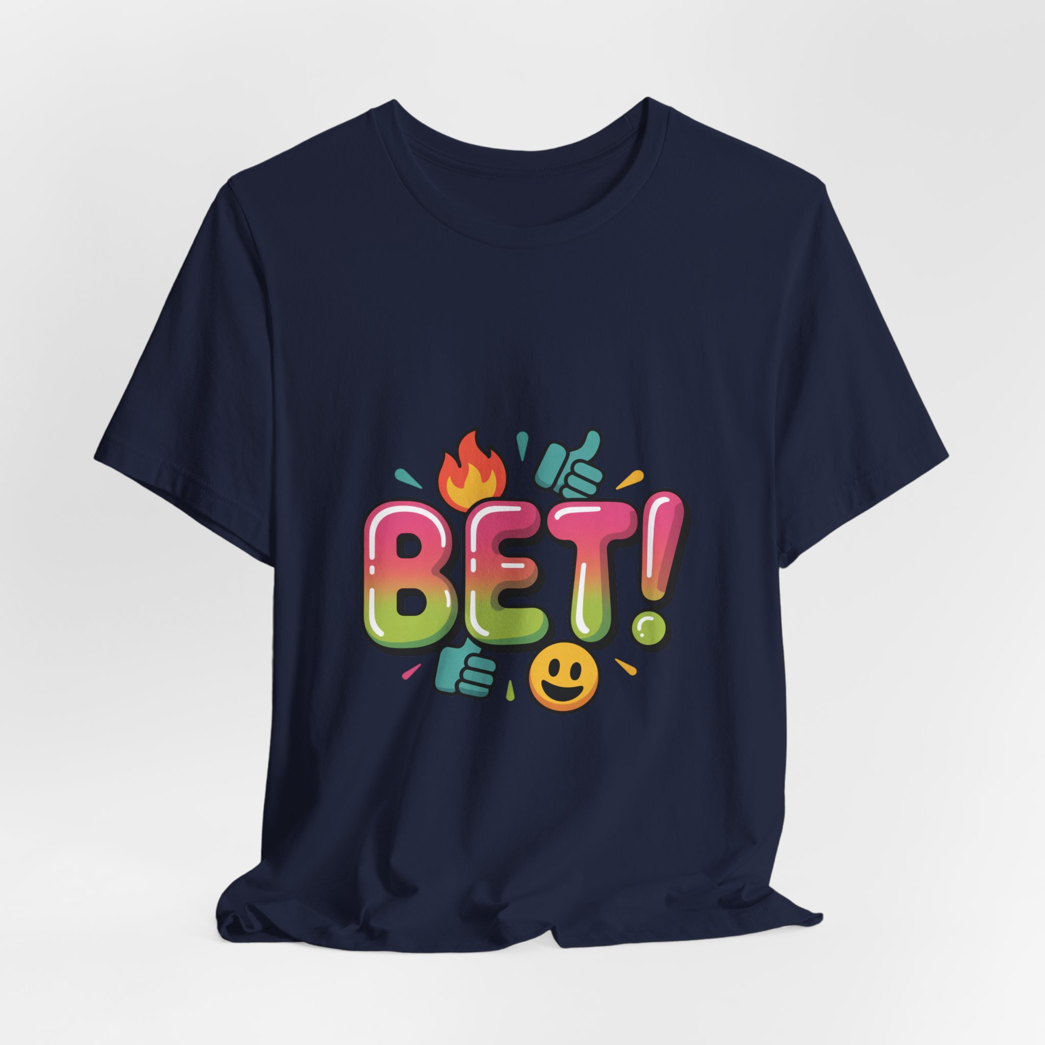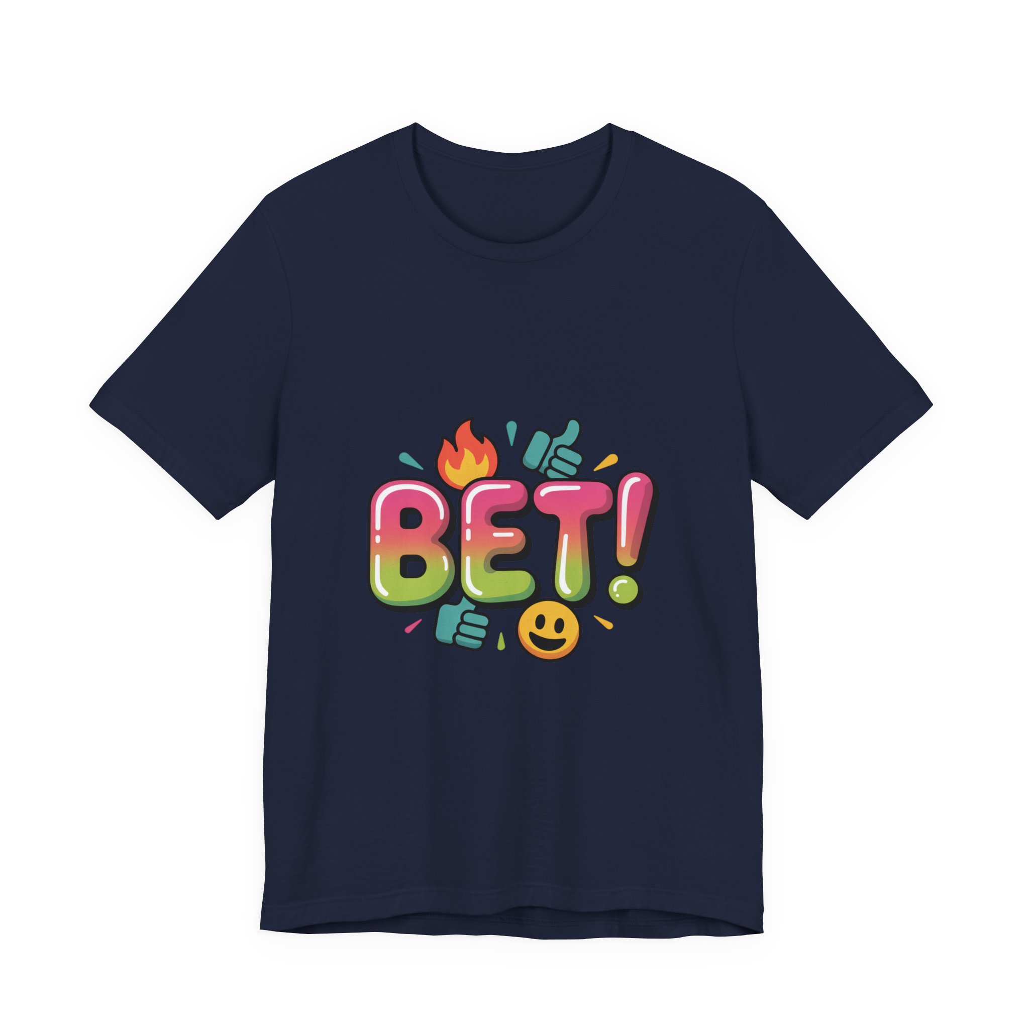 Bright, sticker-like “BET!” graphic in bubbly, meme-ready lettering—a Gen‑Z slang tee that reads like a playful chat reaction. The colorful, gradient-filled text with emoji and hand icons leans into internet-lingo aesthetics, offering a fun, social-first vibe for creators and trend-savvy shoppers who want a quick, scannable statement in their feed. Lightweight and casually cut, it layers easily under jackets or pairs with streetwear for everyday content creation and hangouts.